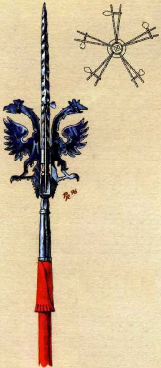 Да ис приказу Серебряные палаты принято шесть кругов медных золоченых, на них орлы двоеглавые чеканные, в правой лапе меч, елевой пушка.