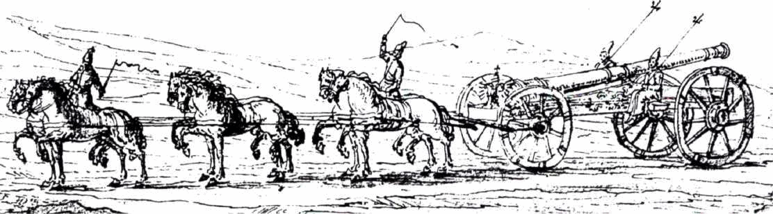 Обычай красить лафеты и зарядные ящики в красный цвет, существовавший в русской армии в течение почти всего XVIII в., также ведет начало с XVII в. Красные лафеты рисовал Пальмквист; упоминаются они и в описании встречи Польского посольства 1667 г.: «... Перед каждой ротой были военные орудия большого калибра, называемые простонародьем «мучителями», каковых мы насчитали до 35, все поставленные на телеги и уже заряженные, как бы готовые поступить в дело. При каждом таковом орудии находились два человека для управления ими; кони все одношерстные белые, а зарядные ящики красные».