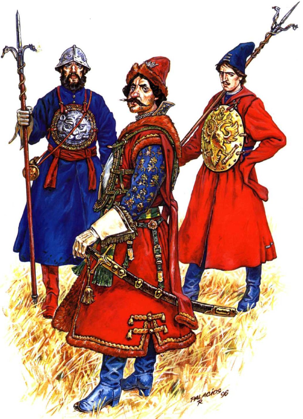 На основании имеющихся сведений можно заключить, что в мундирном платье московских пушкарей преобладали красный и синий цвета, т.е. такие же, как и у регулярных артиллеристов эпохи Великой Северной войны 1700-1721 гг4. Потешный бомбардирский кафтан самого Петра I 1696 г. был также красным. В 1702 г. в Петербургском Артиллерийском цейхгаузе хранились старые, еще времен Пушкарского приказа, «...кафтаны строевые сермяжные белые; шапки бархатные, с чеканными золочеными досками; то же суконные красные, шитые золотом и серебром; то же голубые, украшенные гербами или овчинами серыми». Следует пояснить, что «строевыми» тогда назывались повседневные, нецветные кафтаны, а «чеканныезолоченые доски» — это, возможно, аламы, а не украшения на шапках. Наряду с красными и синими, но значительно реже, встречались зеленые пушкарские кафтаны, например, упомянутый выше кафтан 1664 г. Князь Б.И.Куракин, упоминая в своей «Гистории» потешные стрельбы 1690 г., также пишет: «...и который пушкарь убьет в цель, бывало награждение— каждому по 5 рублей и по сукну красному или зеленому на кафтан». Начальные люди московских пушкарей носили «цветное» платье и выходили перед строем, как и «...полковники, и головы, и полуголовы стрелецкие в ферезеях и в кафтанах Турских в бархатных и в объяринных цветных».