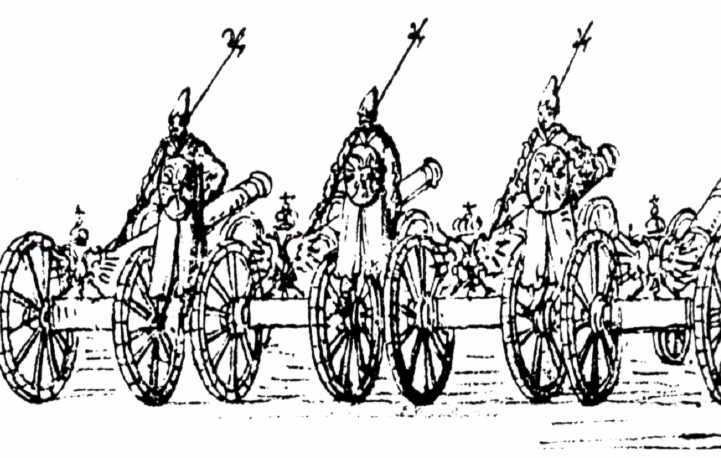 | Расположение московских пушкарей с аламами и пальниками при въезде иностранного посольства. (Рис. из книги Э.Пальмквиста. 1674 г.) |