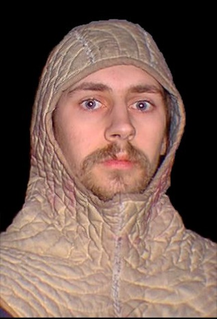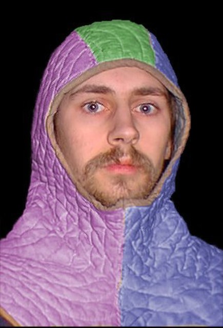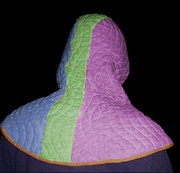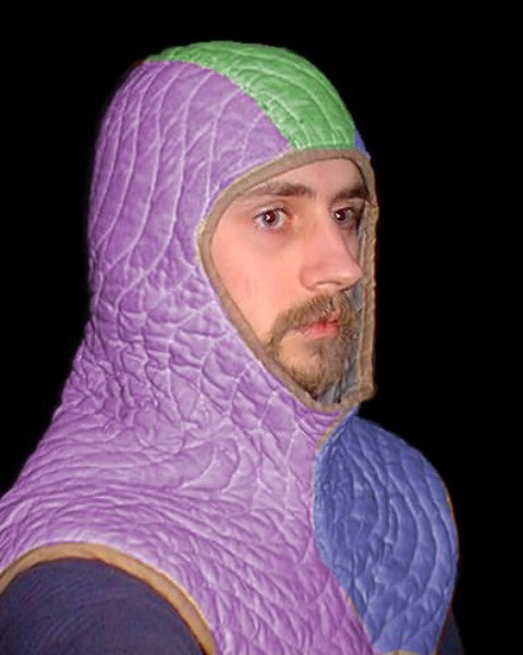 Данный капюшон-подшлемник с ожерельем предназначен для ношения под кольчужным капюшоном, который поддевается под Грейтхельм. Данная модель подшлемника подходит на период с нач. 14 ст. и до конца 16 ст. Подшлемник пошит из льняной ткани, внутри наполнен ватой от старого одеяла. Он хорош не только тем что окончательно рассеивает энергию удара, но также впитывает пот. После каждого боя рекомендуется сушить подшлемник, а то он будет не только вонять, а начнет еще и гнить. Сшить стеганый подшлемник совсем не сложно, особенно если у вас или ваших друзей есть швейная машинка, можете и вручную пошить его самостоятельно. Модель, состоит из трех частей, фото и рисунки которых приведены выше и ниже. Эти три части выделены сиреневым, зеленым и синим цветом.