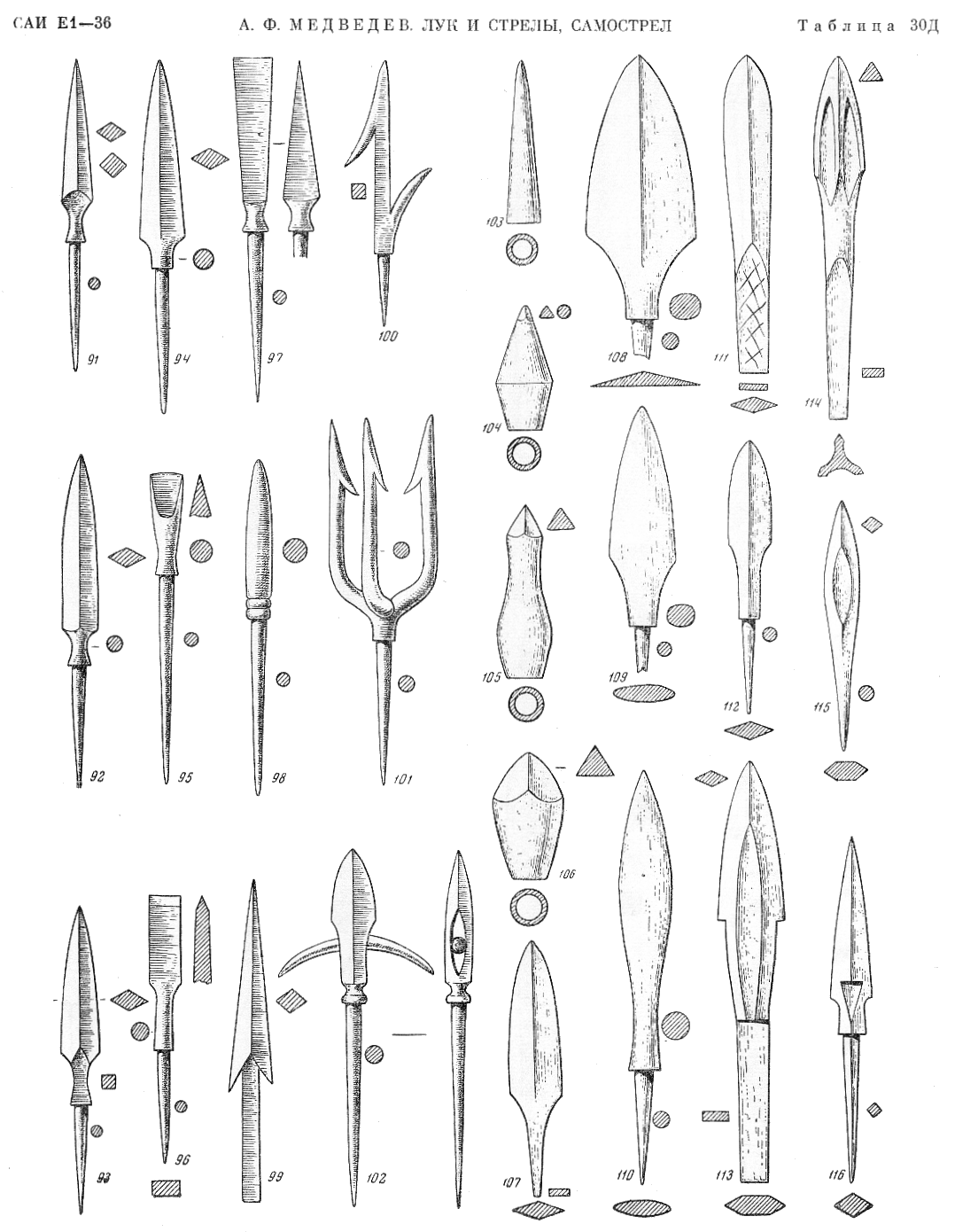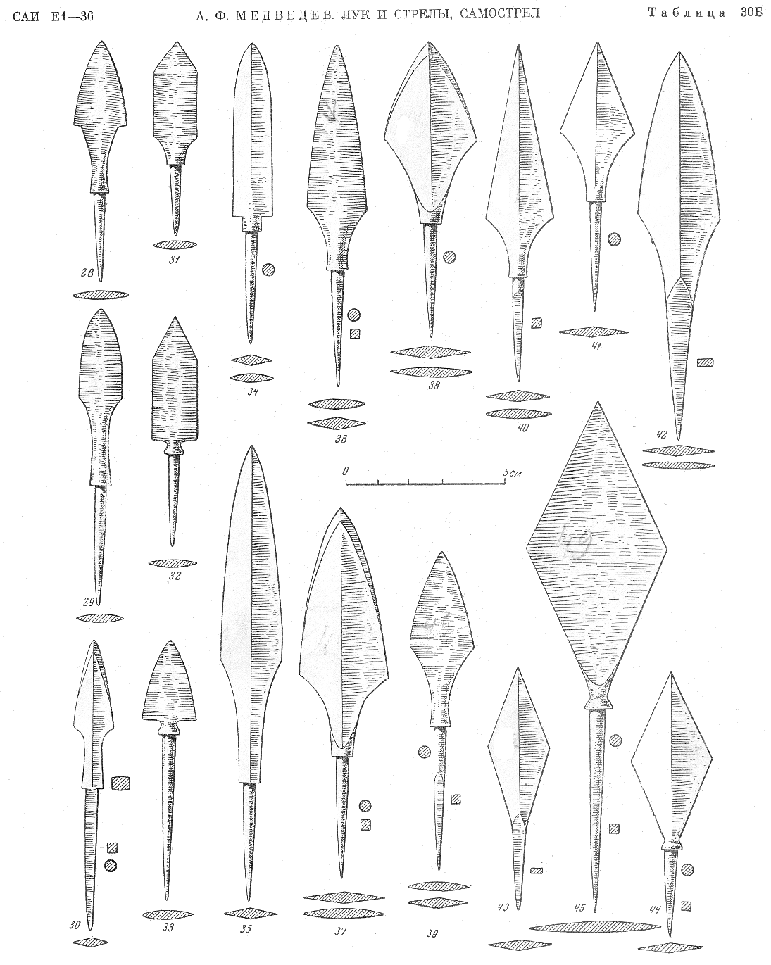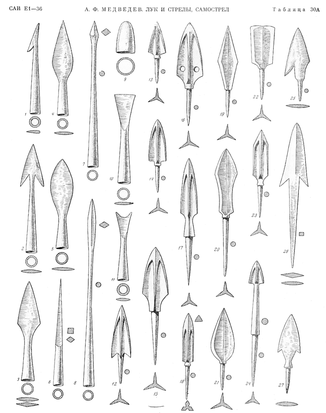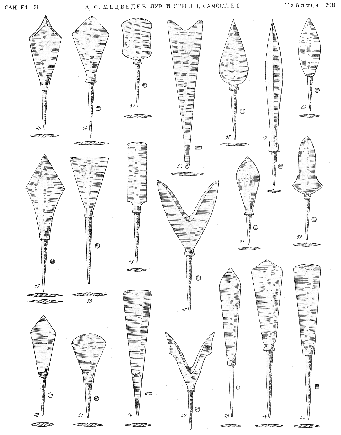 | Табл.30 Б Типы наконечников стрел Восточной Европы VIII–XIV вв. | Табл.30 В Типы наконечников стрел Восточной Европы VIII–XIV вв. |