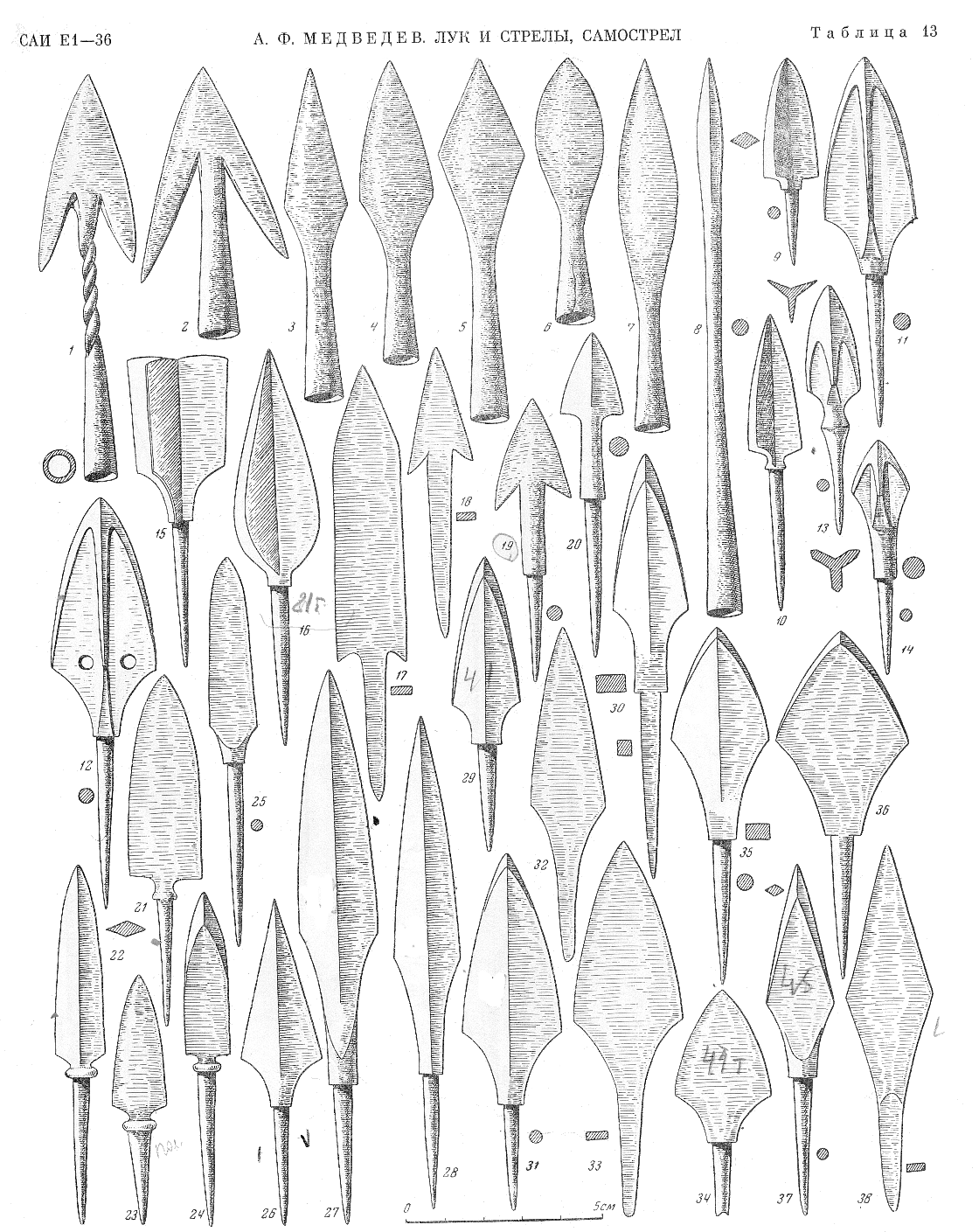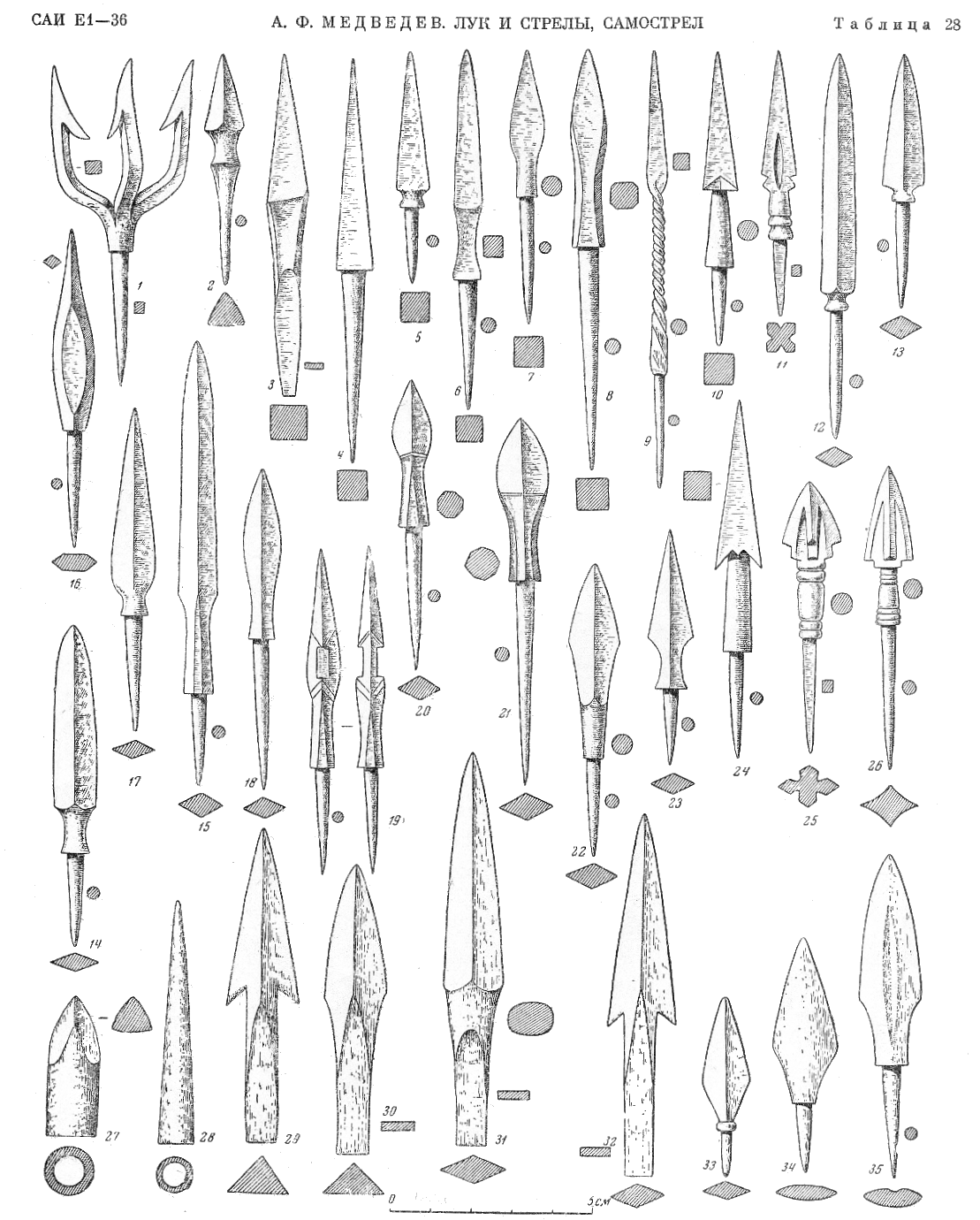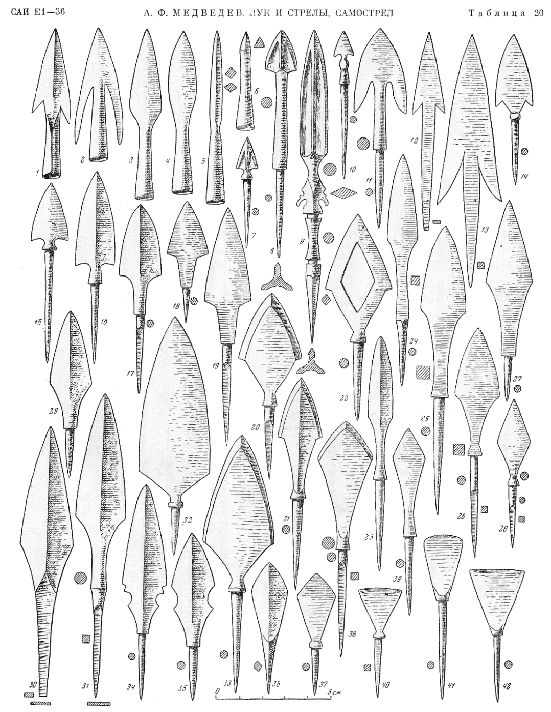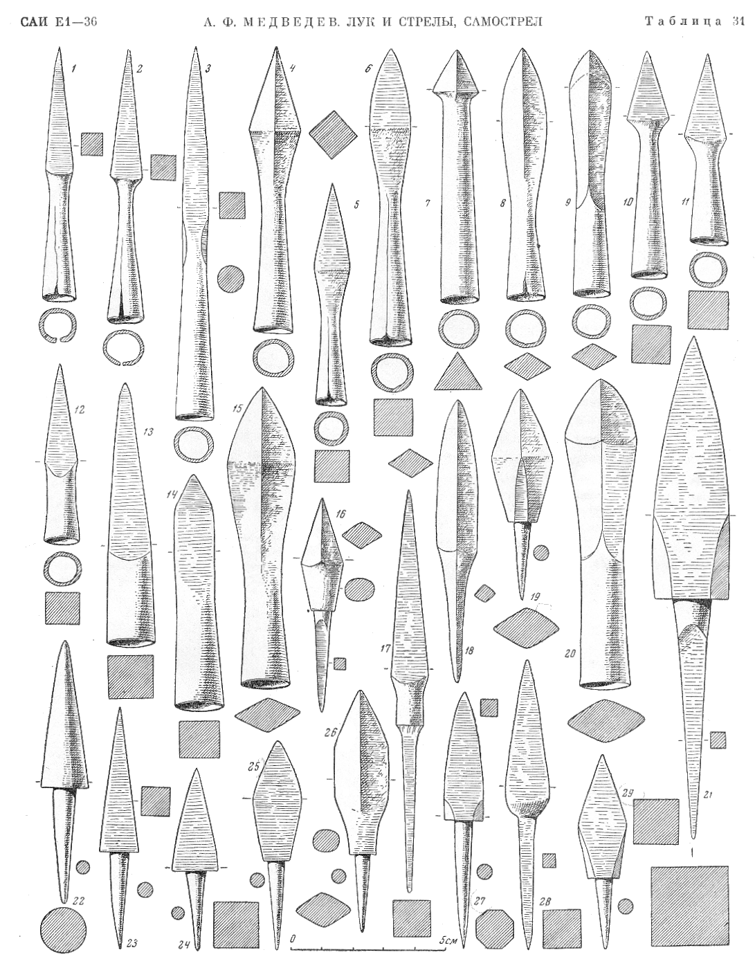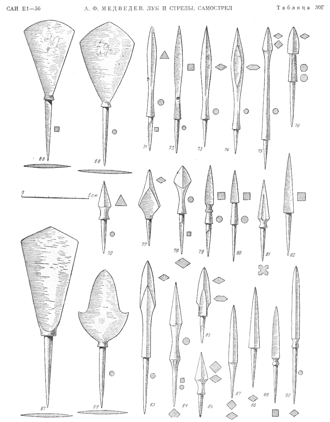 | Табл.30 Б Типы наконечников стрел Восточной Европы VIII–XIV вв. | Табл.30 В Типы наконечников стрел Восточной Европы VIII–XIV вв. |