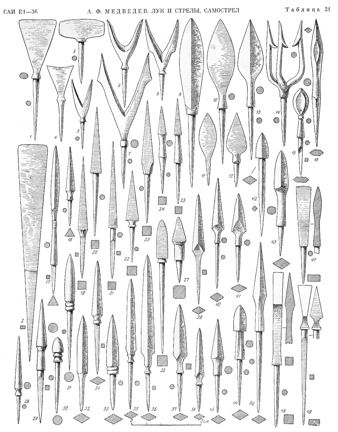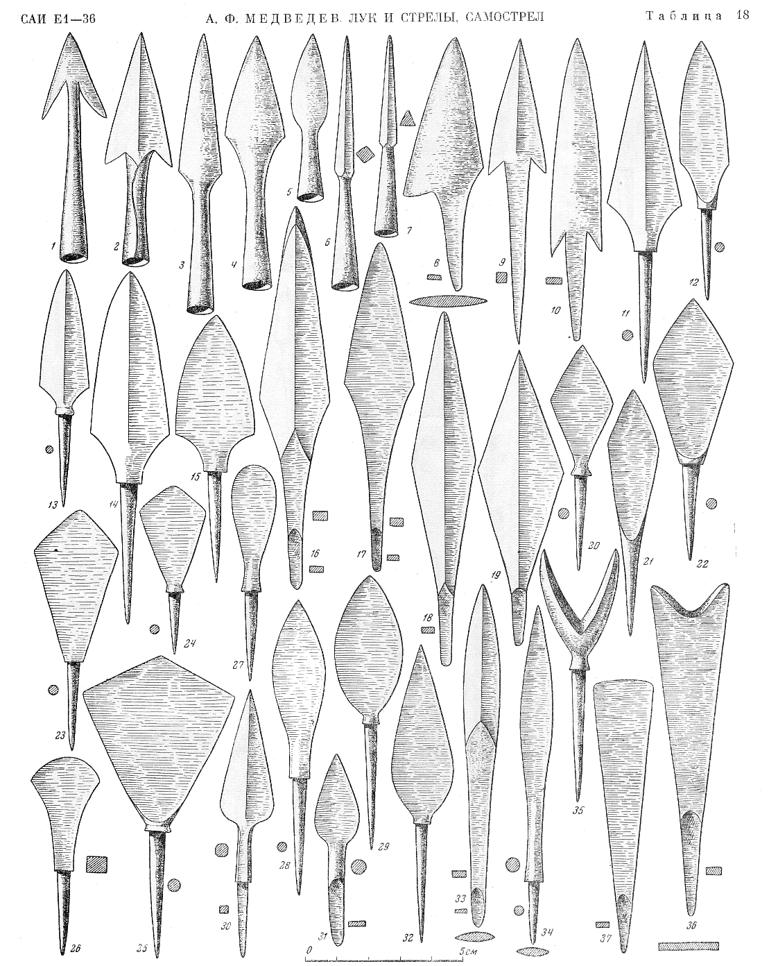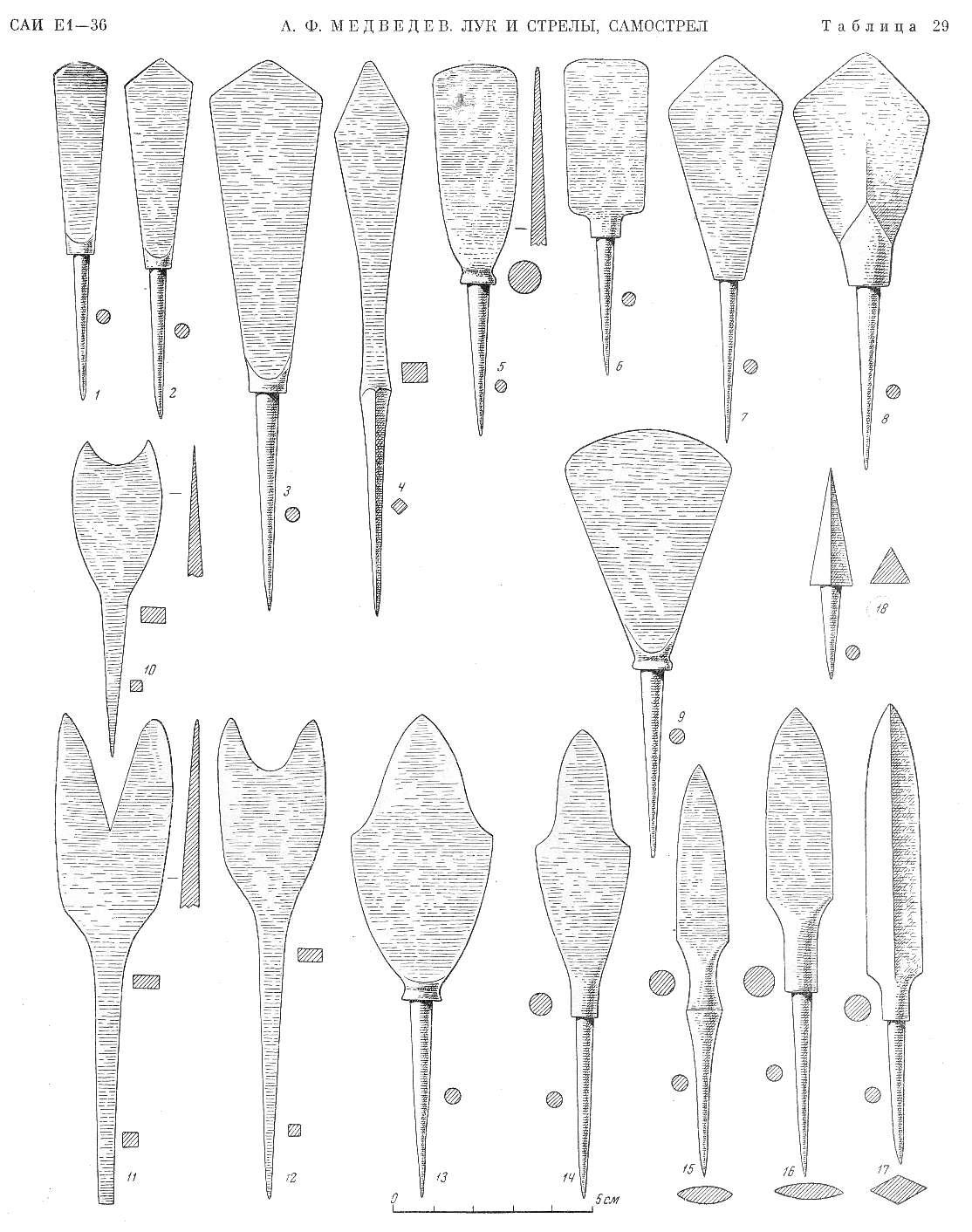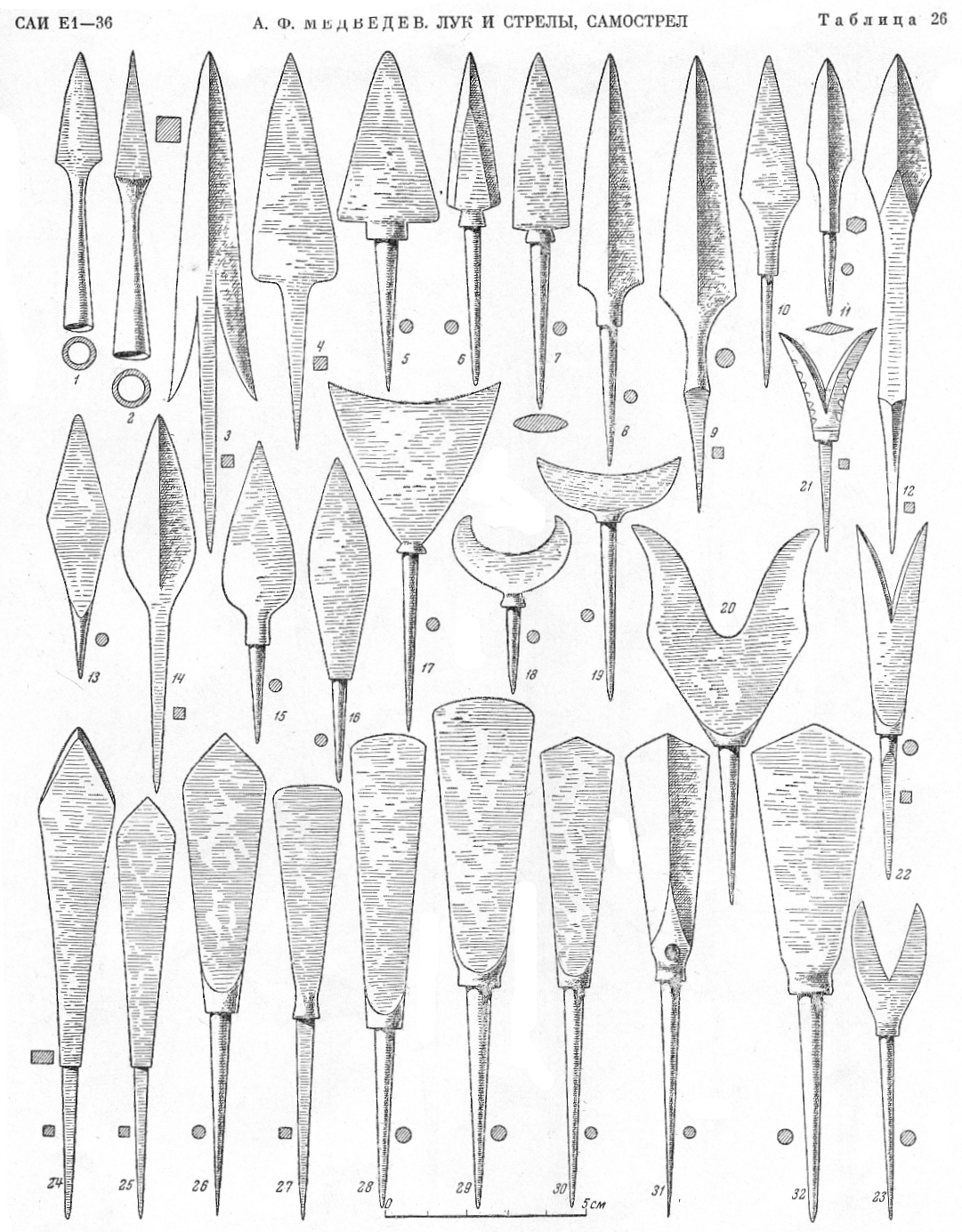 | Табл.30 Б Типы наконечников стрел Восточной Европы VIII–XIV вв. | Табл.30 В Типы наконечников стрел Восточной Европы VIII–XIV вв. |