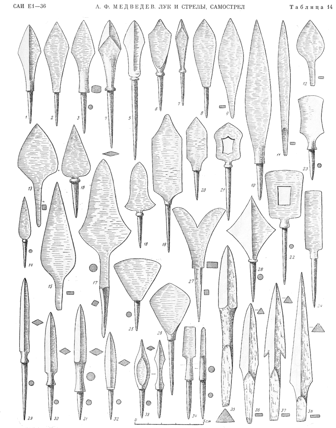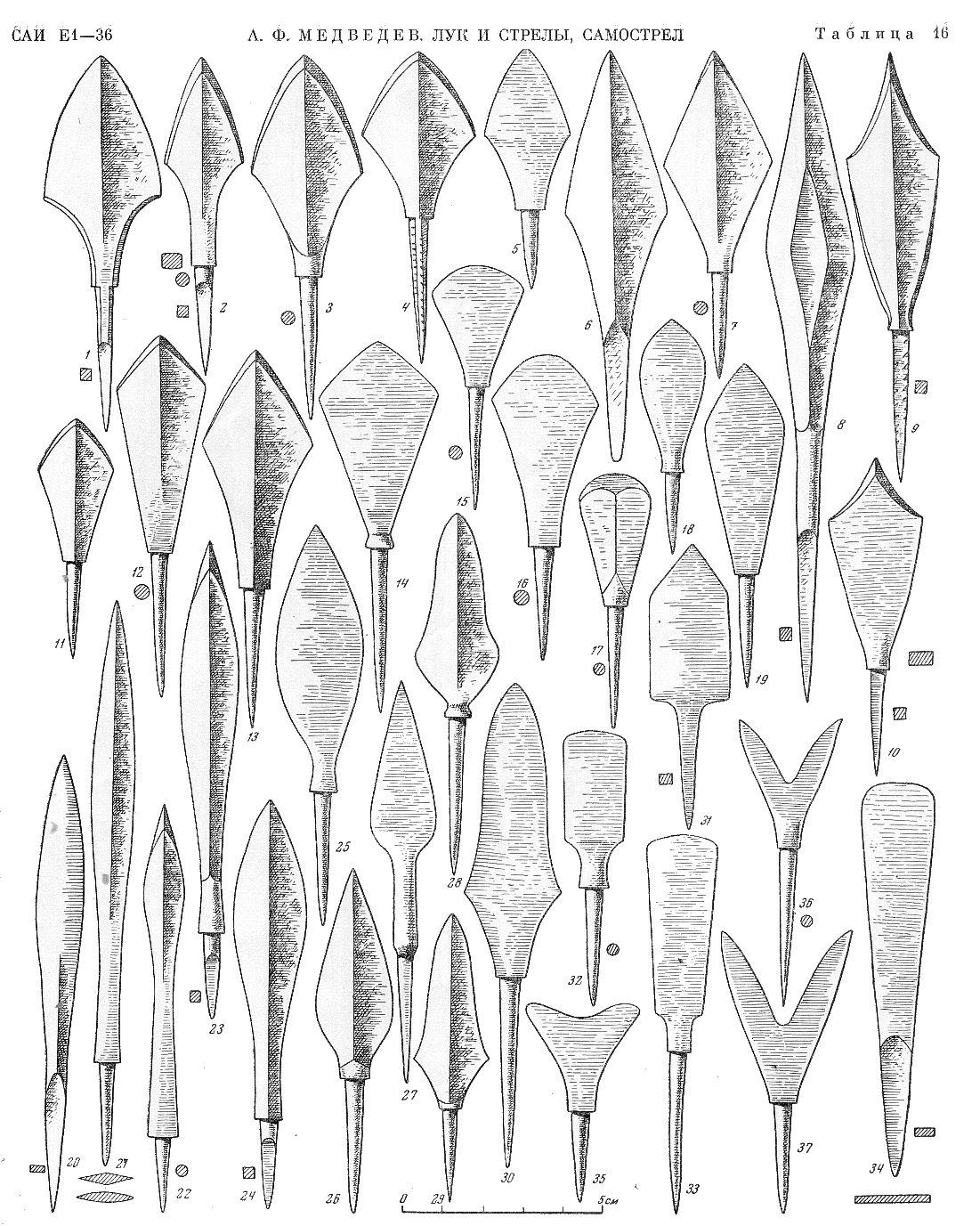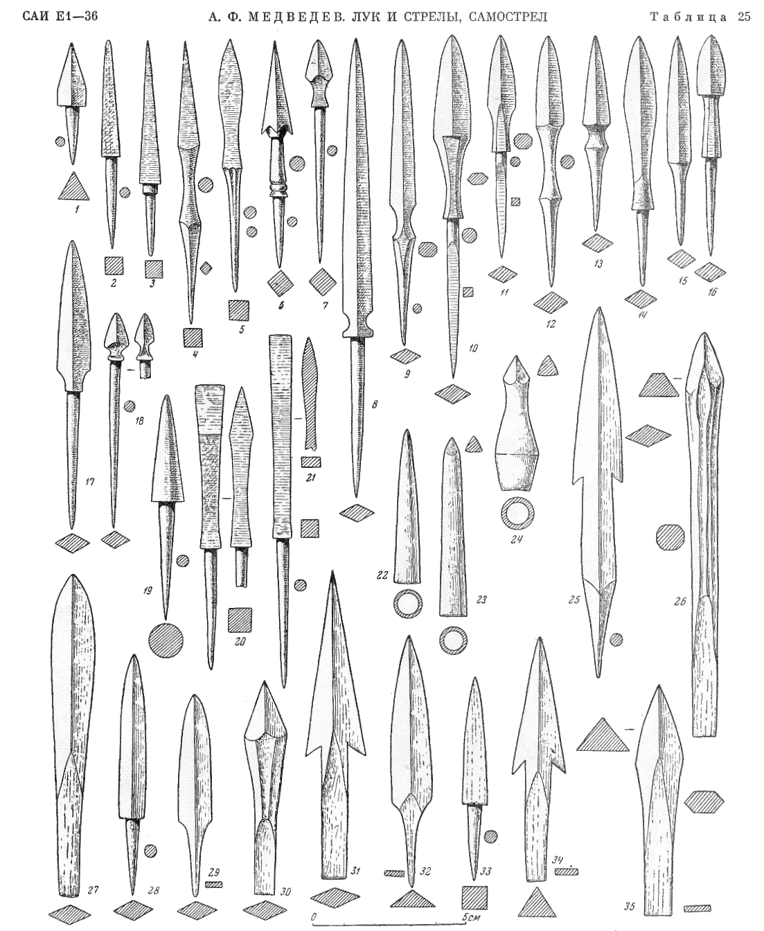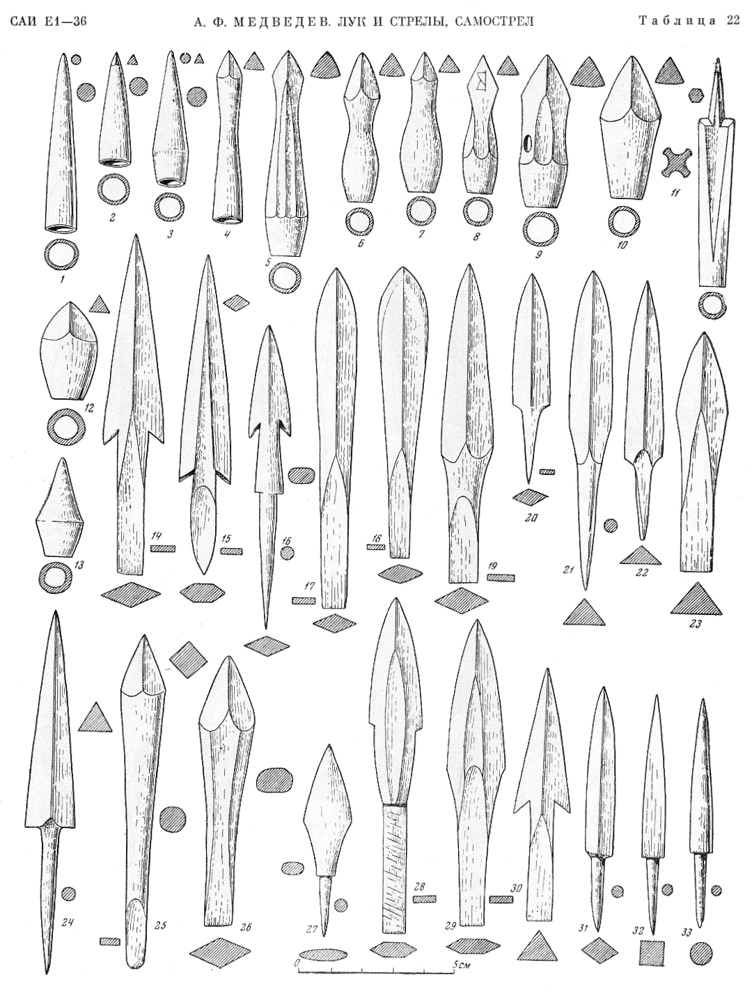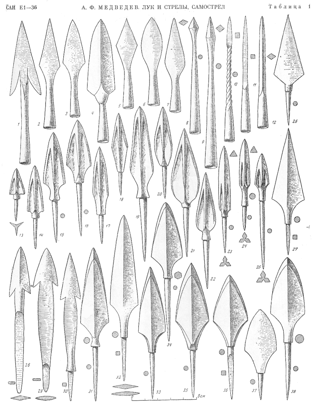 | Табл.30 Б Типы наконечников стрел Восточной Европы VIII–XIV вв. | Табл.30 В Типы наконечников стрел Восточной Европы VIII–XIV вв. |