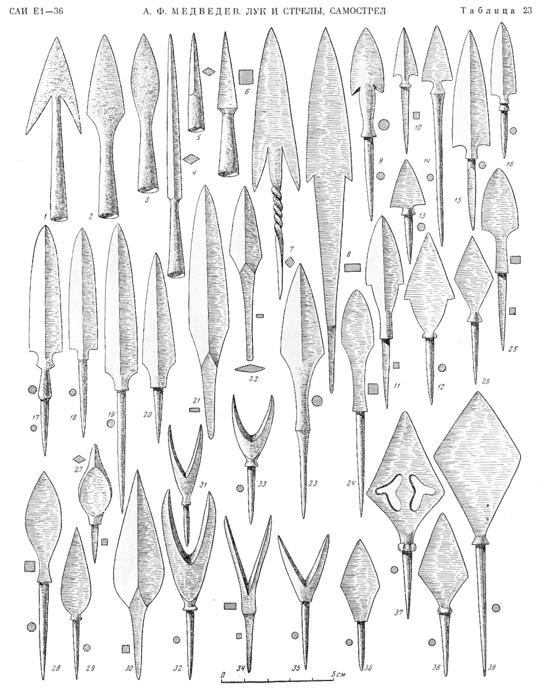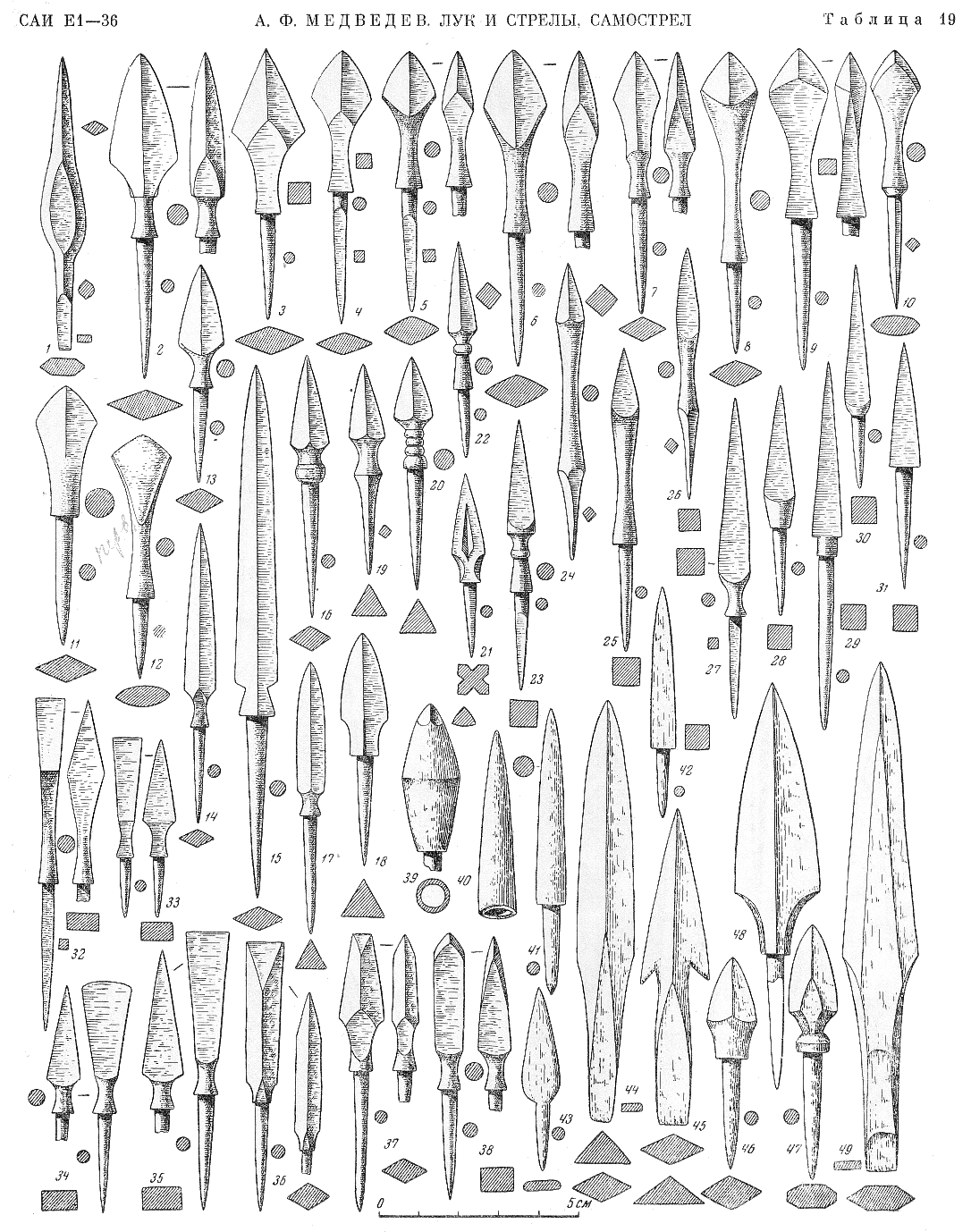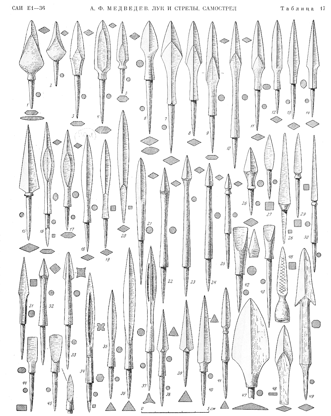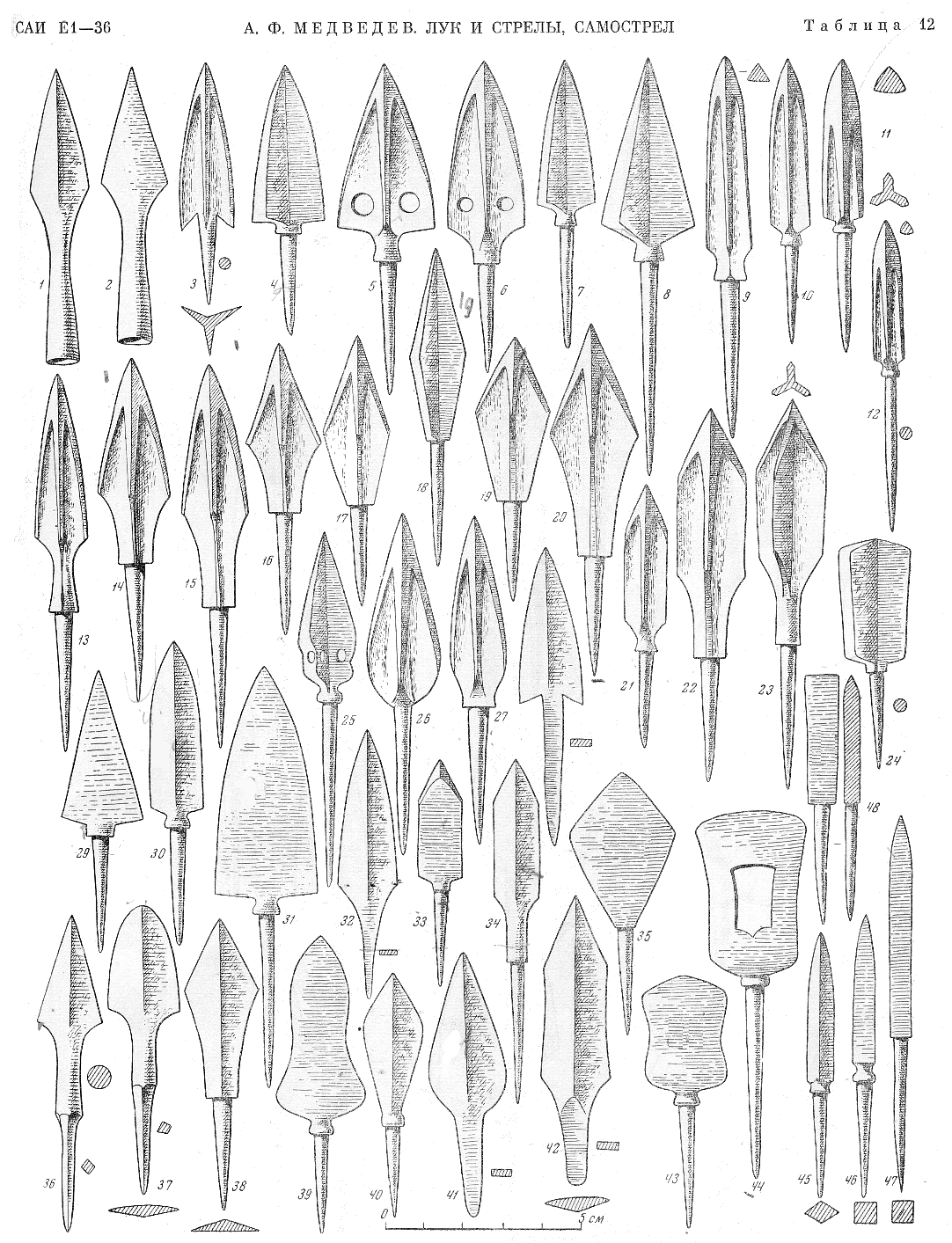 | Табл.30 Б Типы наконечников стрел Восточной Европы VIII–XIV вв. | Табл.30 В Типы наконечников стрел Восточной Европы VIII–XIV вв. |