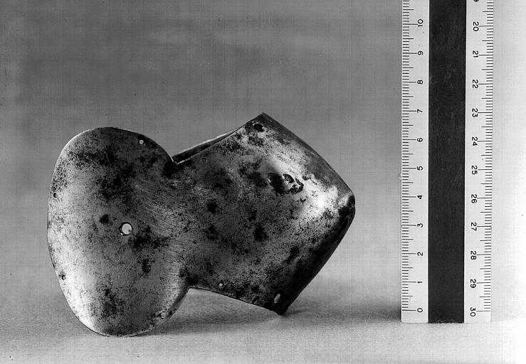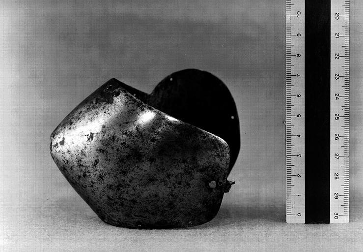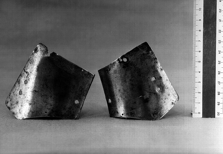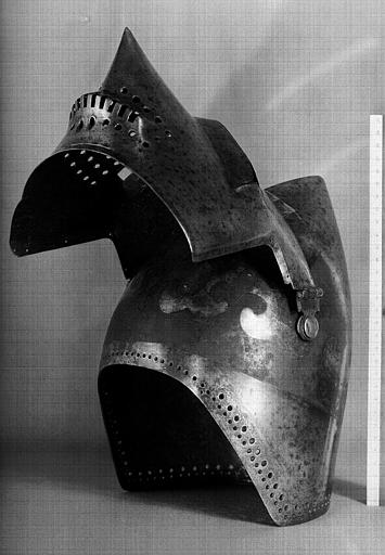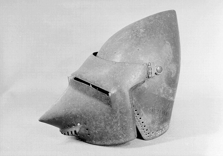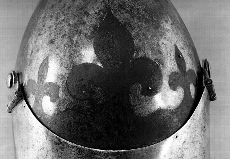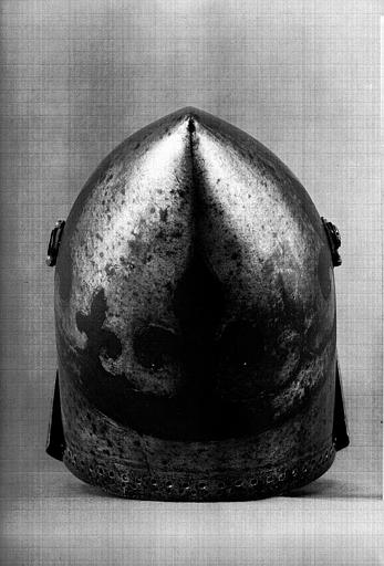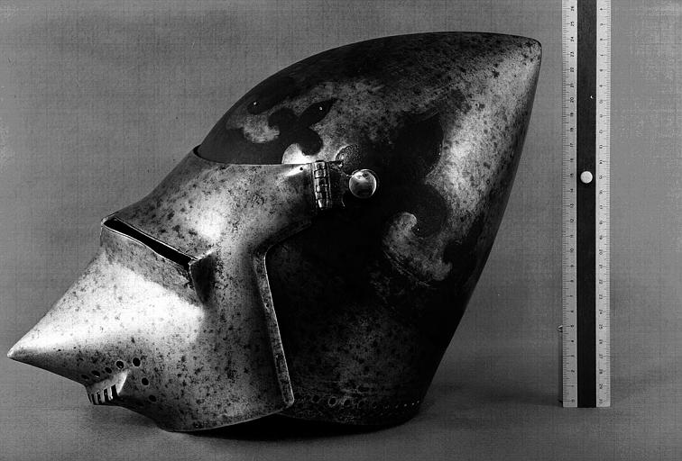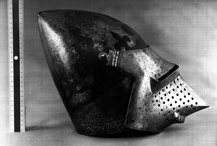 Бацинеты с забралом "Воробьиный клюв"(франц. Bacinets a bec de passereau) примерно 1380-1420 г. инв. H.16, H.20, H.21. Терминологии в разных странах отличается. Наплечник (франц. Epauliere) и наколенник (франц. Genouilliere) примерно 1400 г. инв. G.426. Числятся как один предмет.