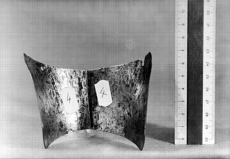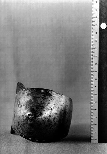 Пурпуон Карла VI из хранилищ Шартрского собора, до реставрации. Детский бацинет из хранилищ Шартрского собора (Chartes cathedrale). Датирован 1390 годом. Сохранился с оригинальным авентайлом, но некоторые вервеллы потеряны. Узор на тулье сделан при помощи воронения.  Наколенник, нога полностью, сабатон.