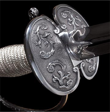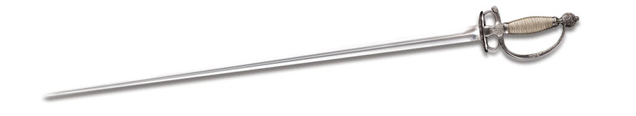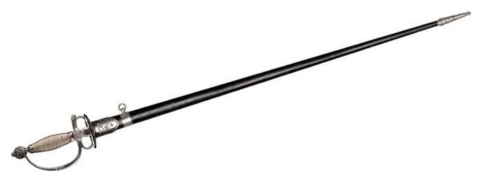 Спецификация: Вес шпаги: 640 грамм (22.6 унций) Ширина клинка: 1,1 см (7/16 дюйма) Длина клинка: 79.4 см (31 1/4 дюймов) Полная длина: 97.15 см (38 1/4 дюймов) Длина рукояти: 17.78 (7 дюймов) Хвостовик рукояти покрыт деревом и оплетен проволокой. Ножны из толстой дубленной кожи, накладки из полированной стали