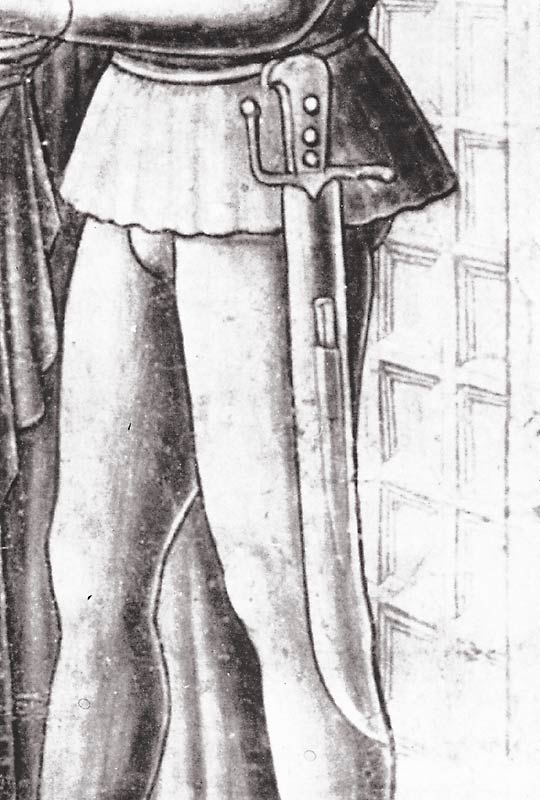 | Наверное самое раннее изображение Эрзац-фальчиона, иллюстрация альбома Вильярда де Оннекурта. 1230 г. | Полная длина этого изделия 77 см. Клинок 58 см. | "Богемский фальчион" – Дюссак. Нимбрук Богемия, конец 16 века. |