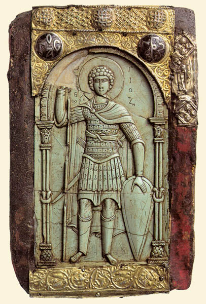 | Венгерская сабля 10 века. Прекрасный образец во всех отношениях. | Икона св. Георгия 11 века. Монастырь Ватопеди. Греция. | Святой Меркурий. Фреска. Церковь в Охрид 1295 год. Сербия. |