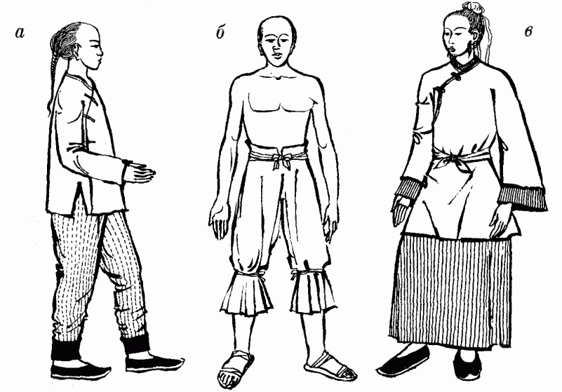 | Мал. 2 Чоловічий одяг. Китай. VII—XVII ст.: а) простьобані штани, заправлені в шкарпетки й обв'язані обмотками; б) штани, підв'язані під колінами; в) куртка поверх халата. Рис. 2 Мужские одежды. Китай,.VII—XVII вв. |