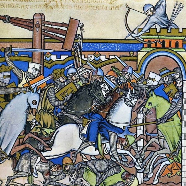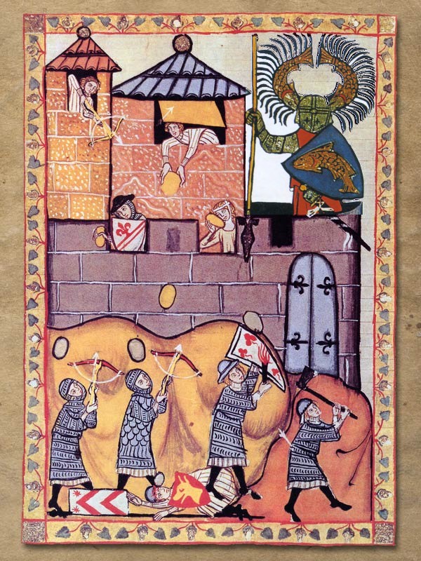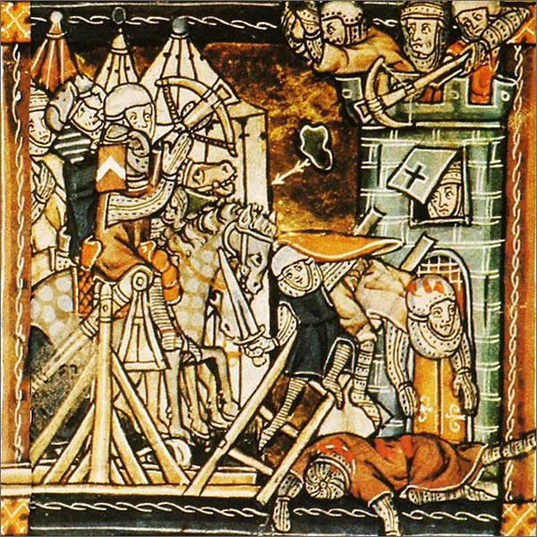 Рис. 22 Нападение на башню, начало 14 века, пример арбалетного огня. Посмотрите внимательно на воина, падающего с лестницы