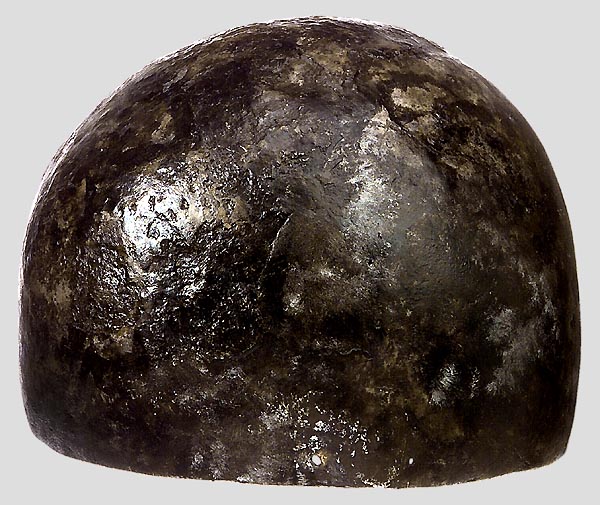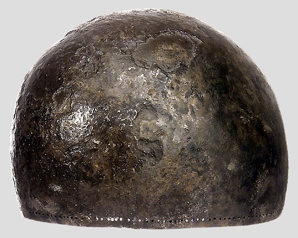 Полукруглый купол шлема цельнокованный из одной железной пластины. Несколько уплощённый перед приподнят кверху. Явные следы ковки чётко видны на внутренней поверхности шлема (Рис. 4). Наружная поверхность шлема гладко заполирована. Нижняя кромка обрамлена железной полосой шириной около 2,5 см с расположенными в ряд 63 заклёпками в верхней части полосы. Ниже в обрамляющей полосе расположен второй ряд из 66 заклёпок, не соединённых с куполом, поскольку низ полосы спускается ниже кромки шлема. Если верхние заклёпки несут определённую функциональную нагрузку, нижние чисто декоративны. В самом низу, почти по краю обрамляющей полосы, находится круговой ряд тесно расположенных небольших просверленных отверстий для крепления подкладки шлема, которая должна была смягчать давление на голову воина. В этих отверстиях были обнаружены следы кожи и ткани.