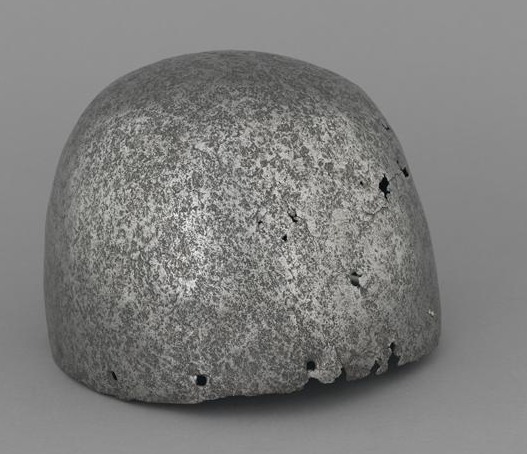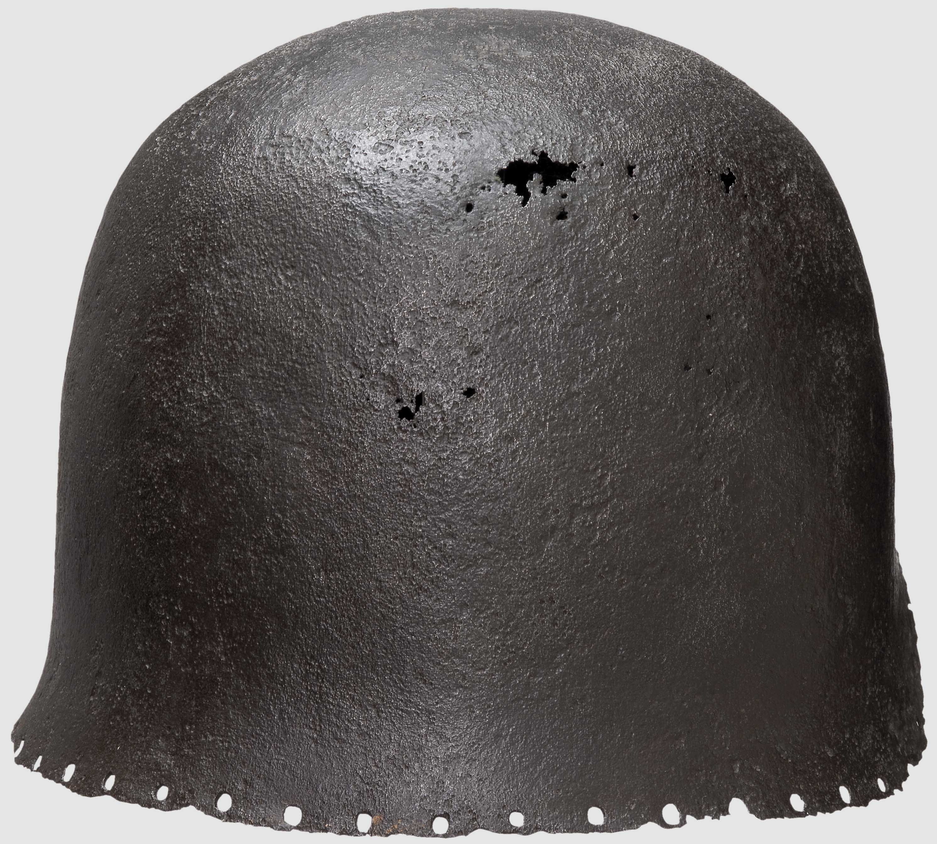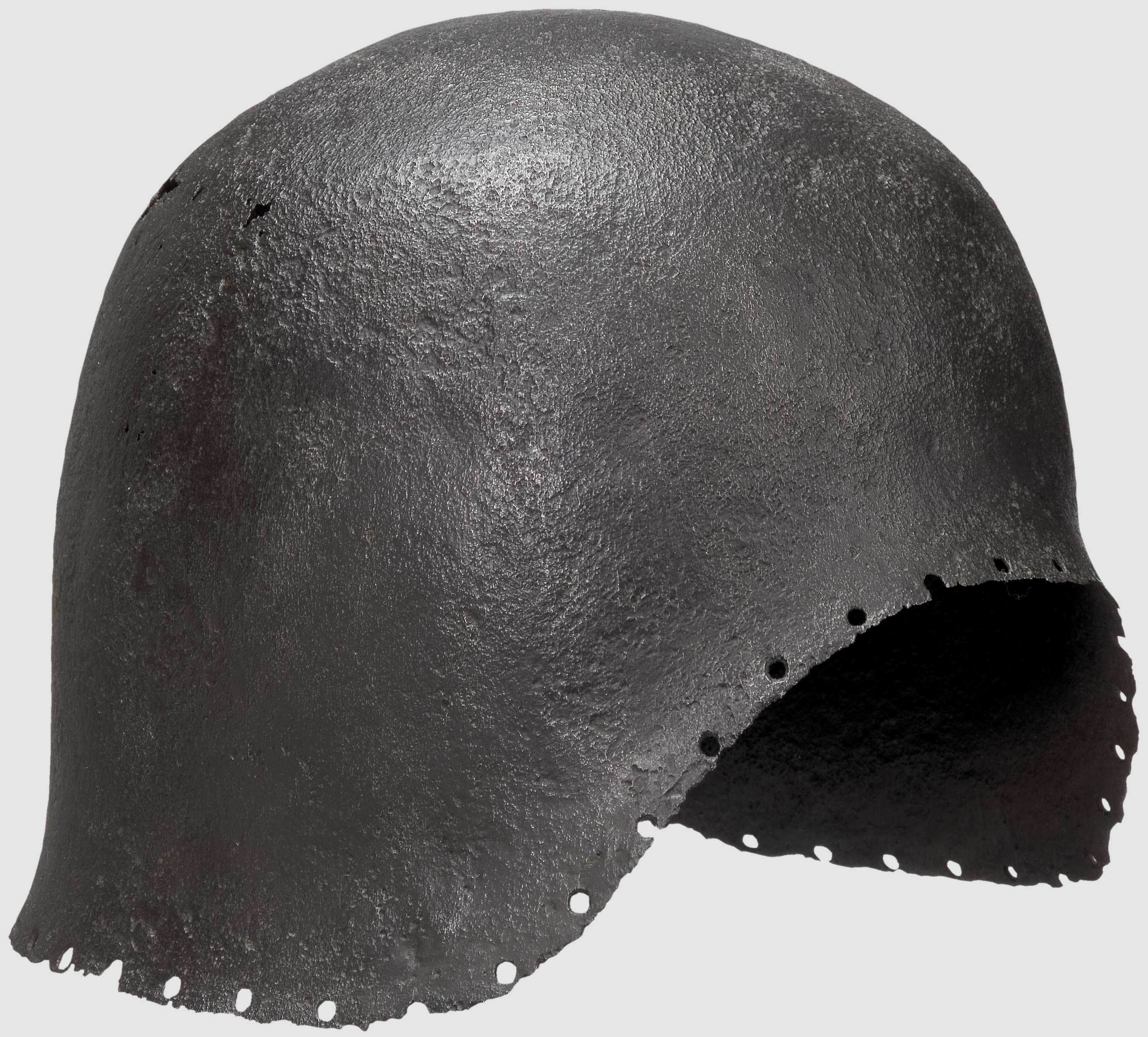 Цельновыкованая тулья с полукруглым вырезом для лица и слегка расклешенными краями. По периметру с отверстиями для подкладки. Знак оружейника выбит с внешней стороны защиты шеи. Найден при раскопках, очищен, поврежден коррозией, но в общем сохранился неплохо. Высота 19,5 см.