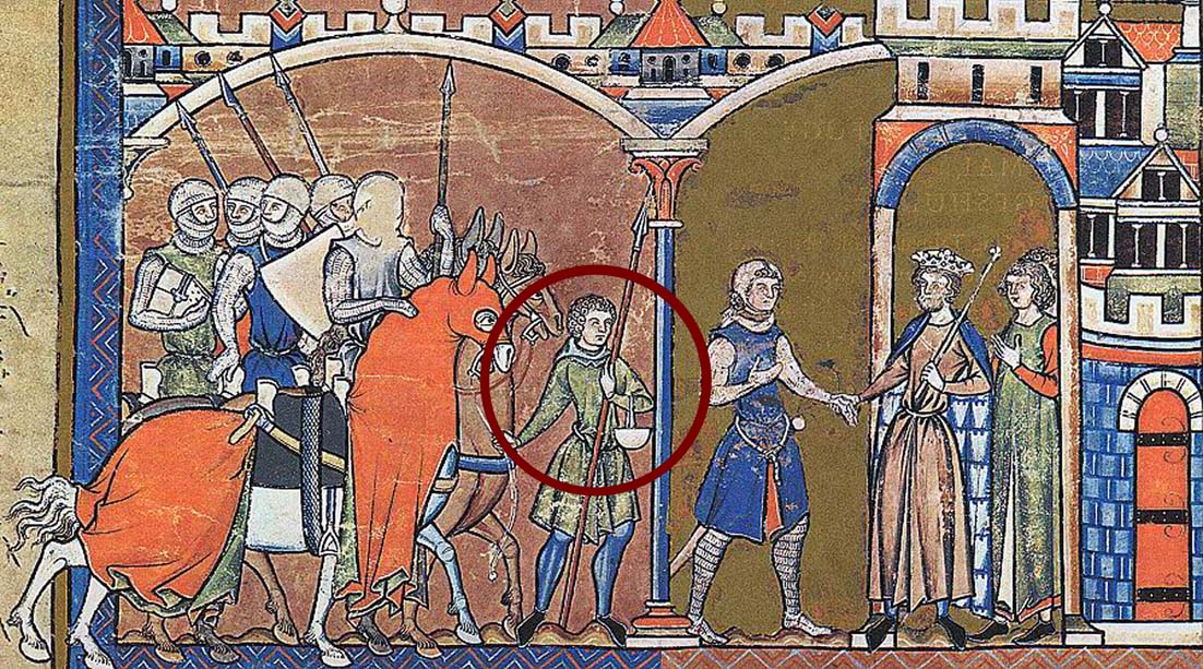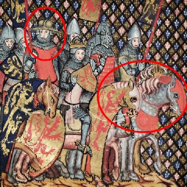 Рис. 18 Рыцарь слез с коня чтобы поздороваться с королем, оруженосец держит его Сельвильер за подбородочные ремешки. Рыцарь в чепчике, чепчик как полноценный головной убор не воспринимали – снимать чепчик в знак приветствия не требовалось. На заднем плане два рыцаря в Черепниках с кольчужными бармицами.