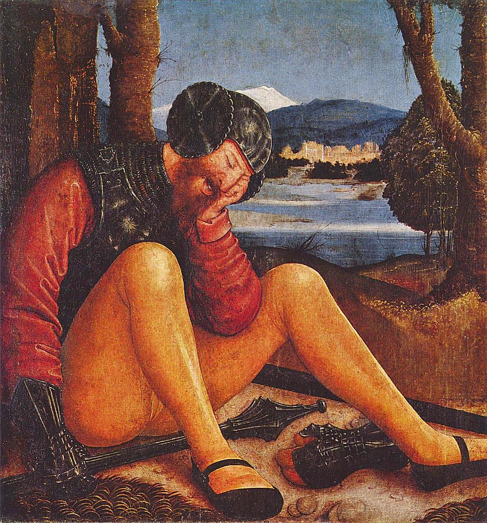 Рис. 43. Глупо носить шлем без подшлемника и без ремешков. При чем насколько это глупо видно на этой картине.  Полиптих "Донны Бриджиты" (Polittico di donna Brigida) 1479г. Рис. 44. У воина Черепник с дисковидными наушами. Бернхард Штригель. (Bernhard Strigel. Coffin of holygrave in Fraunenkurshe to Memlingen: Sleeping GrabwArcher)