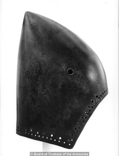Рис. 49. Напомню так выглядит "классический" Бацинет. Округло-конической формы, глубокий со скошенной к затылку верхушкой. Из Королевских Арсеналов в Лидсе 1390 г. iv 497. Еще одно фото Рис. 50. А вот шарообразный но глубокий, и таких немало. Из Национального Музей в Нюрнберге. инв. номер w1271.