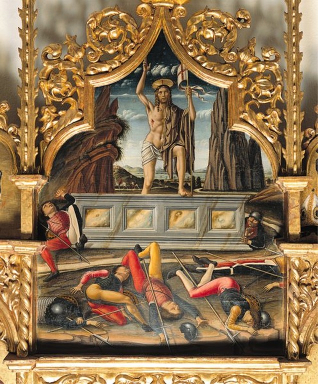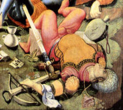 Рис. 45. И еще одна сцена воскресения 1519 года, написанная Йоргом Райтгебом (Jörg Ratgeb), который был капитаном Ландскнехтов  и был казнен в Пфорцхайме (Pforzheim) в 1526 году, его разорвали четыре лошади. Поэтому я думаю что к его картине нужно отнестись с особым вниманием. Тут один воин изображен в Черепнике с ремешками, у друго Шаллер с полузабралом, у третьего на голове только подшлемник. Много интересных деталей это и кувшин из под вина и карты и фляга. Оружие: Двуручный топор, аркебуза, арбалет и двуручная булава. Обращает на себя внимание и непонятная одежда воинов, как будто это снятые с разных людей обноски.