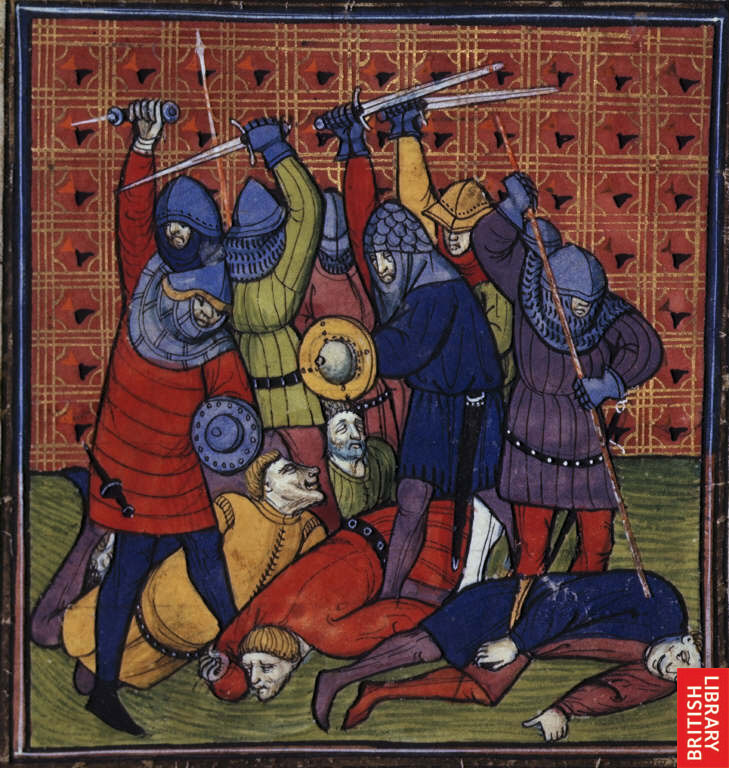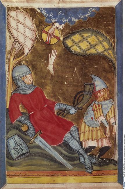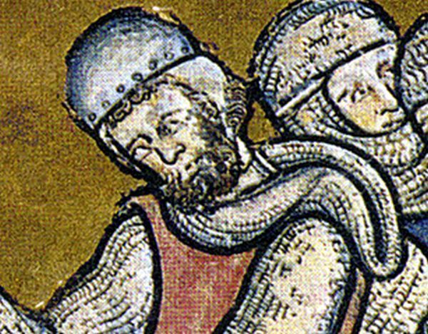 Рис. 21 Битва против жителей Жабеша (Battle against the inhabitants of Jabesh. © Koninklijke Bibliotheek) Из под Сервильров выглядывает подшлемник к которому прикреплена Кольчужная бармица, сам подшлемник держится на заклепках. Интересен пример удара в глазницу Топфхельма