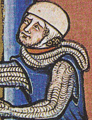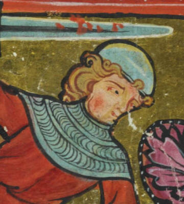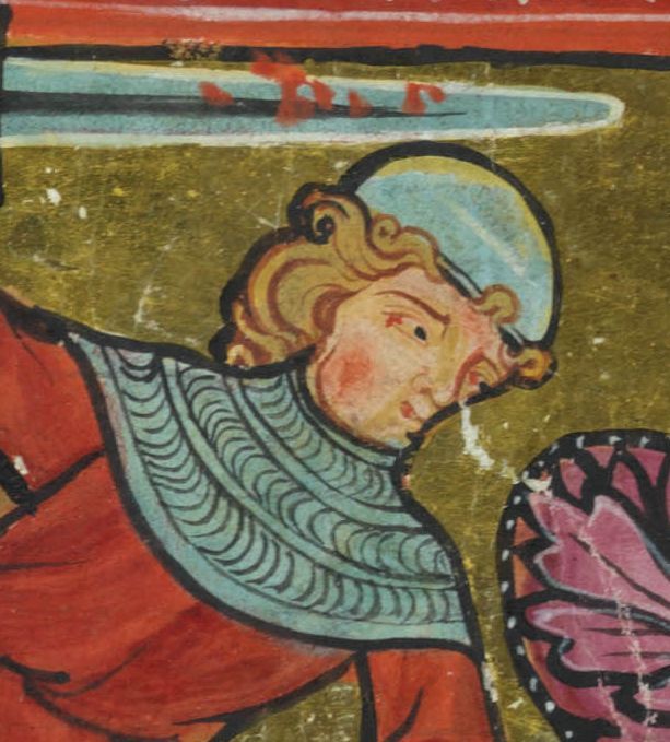 Иллюстраций, показывающих шлем аналогичный по форме шлему из Niederrealty, немало. Вот например "смерть Роланда" из Хроники Рудольфа фон Эймса (Chronique du Monde, Rudolf von Ems) из Берлина, начала 14-го ст. Гредхельм лежит рядом, возможно он был одет поверх Сервильера. Что интересно копия из St Galen (рис. 30) сделана почти сразу после Берлинской, но Роланд изображен в уже поустаревшем, но все еще популярном полном кольчужном кольчужном доспехе представляющем собой единое целое с кольчужным капюшоном. Что как по мне говорит не только о том что эти варианты доспехов некоторое использовались параллельно, но и о том что Черепник должен быть заменить верхушку кольчужного капюшона.