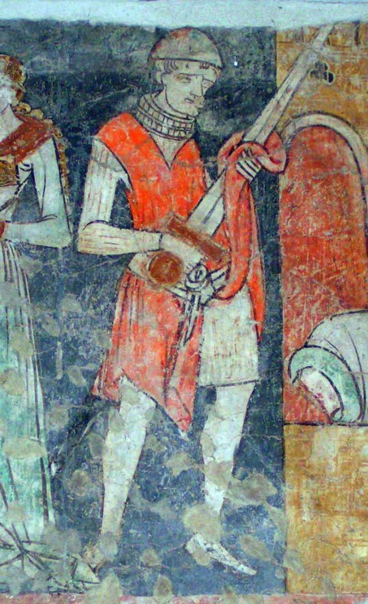 Черепник очень похожий на Черепник на рис. 13, но без отверстий и ремешков носит на голой голове рыцарь, изображенный на фреске второй половины 13 века, см. рисунок 26. Хотя тут возможно мы имеем дело с войлочной шапочкой, которая и есть подшлемник. Но на рисунке 27 изображен рыцарь уж точно в Черепнике без каких либо признаков подшлемника или фиксации, а вместо бармицы кольчужное ожерелье, достоверно ли это изображение или художник что-то перепутал  вопрос дискуссионный. Кольчужные ожерелья часто встречаются в музейных коллекциях. Но вот шлем так носить не хорошо. Оба изображения от Seckau Abtreikirche в Нижней Австрии, относится к 1270