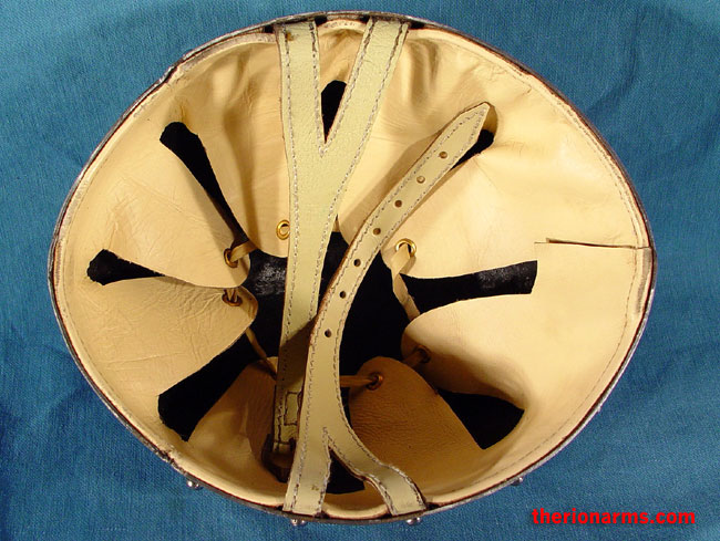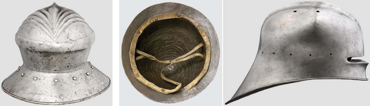 Предыдущие рассмотренные нами шлема для монтажа подшлемника имели множество мелких отверстий для пришивания подшлемника при помощи нитей или тонких кожаных шнурков, или крепление подшлемника проводилось при помощи заклепок, смотрите рисунки 7 и 10. Крепление подшлемника при помощи заклепок было обычной практикой в шлемах позднего возрождения, где через кожаную полосу у основания приклепывался подшлемник-парашут и подбородочные ремни.