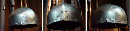 У первого слева шлема  мы можем видеть отверстия для крепления подкладки подшлемника. Третья серия образцов имеет очень маленькие отверстия для той же цели. Для сравнения, на рис. 9 северно итальянский Бацинет-черепник  с точно такими же отверстиями.