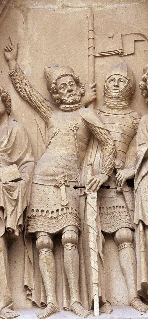 Вот небольшая скульптура рубежа 13/14 веков. На ней мы можем увидеть двух воинов в Сервильерах одетых, на первый взгляд поверх кольчужного капюшона.  Ремешков мы не видим потому что скорей всего эти шлемы  прикреплены непосредственно к подкладке которая должна быть под кольчужным капюшоном. Но если ремешки все же были, то скульптор не захотел их изображать.