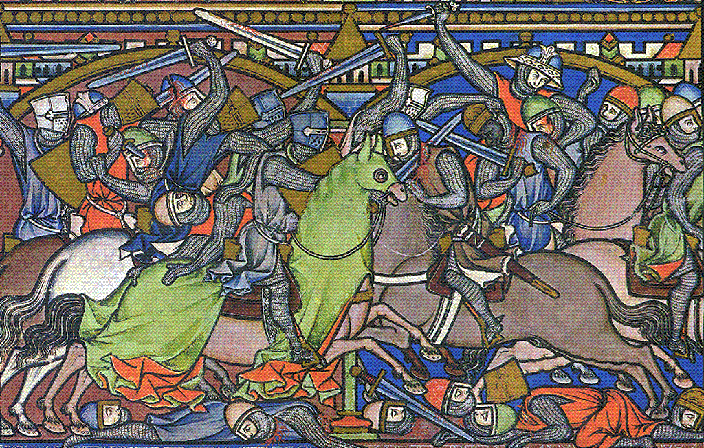 Рис. 24. Битва на Каталунских холмах ( Battle of the Catalaunian plains, between Attila, Aetius, Meroveus and Theodoric I; from Jacob van Maerlant's Spieghel Historiael (KB KA 20, fol. 146v) )1325-1335. Показаны Топфхельмы, Кольчужные капюшоны, и конечно Черепники