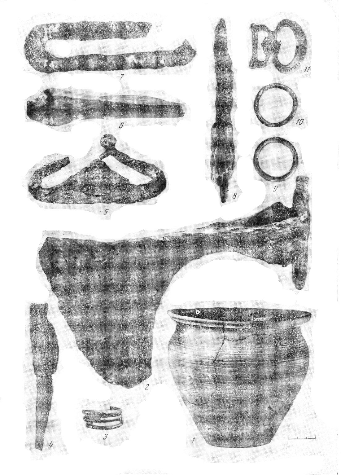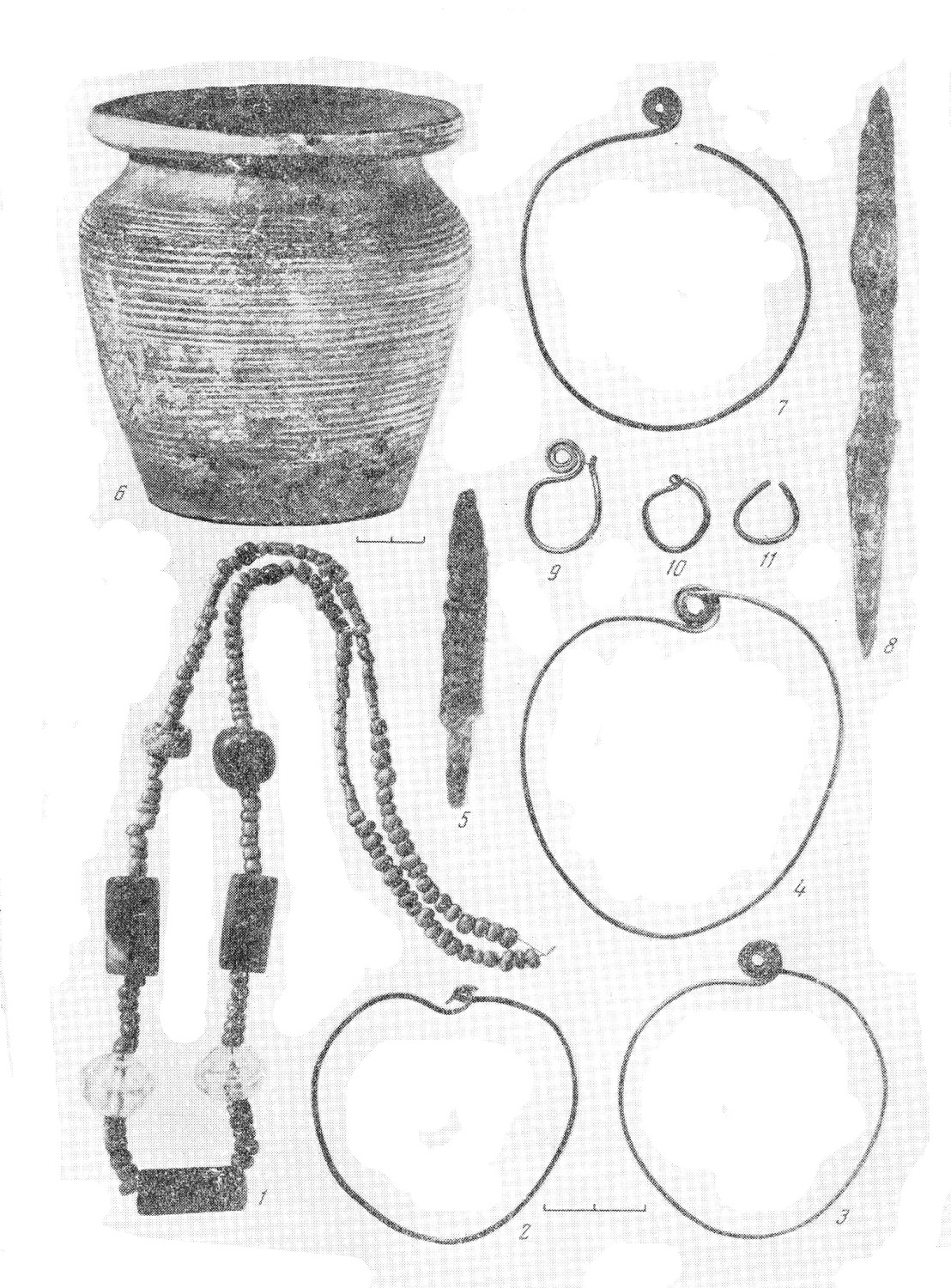 Раскопки могильника выяснили, что население хоронило своих покойников по двум обрядам: по обряду трупосожжения и обряду трупоположения. Обряд сожжения бытовал, вероятно, в разных видах. Под насыпью кургана № 10 обнаружены пережженные кости, захороненные в могильной яме, вырытой в материке. Отсутствие в могильной яме и в насыпи кургана каких-либо следов кострища говорит о том, что сожжение было совершено на стороне. В 1956 г. в одном из курганов меньшей группы могильника обнаружен обгоревший костяк на кострище, т. е. неполное сожжение на месте4. У нас пока нет достаточных материалов, чтобы установить время и этническую принадлежность этих двух погребений. Решить этот вопрос можно будет, вероятно, в процессе дальнейшего исследования могильника. Трупоположения довольно устойчивы по обряду. Покойники положены на уровне древней поверхности, в вытянутом положении, на спине, головой на запад, иногда с отклонением к северу или к югу. Руки сложены на груди или вытянуты вдоль туловища. На погребальной площадке и непосредственно под погребением всегда наблюдаются гнезда золы, мелкие угольки, а иногда пятна сажи или обожженность почвы. Видимо, место погребения предварительно посыпалось золой, принесенной извне, а в некоторых случаях (например, курганы № 6 и 7) на погребальной площадке перед погребением разводился огонь. Зола и уголь, сажистые пятна, обожженность почвы занимают, как правило, не всю площадку, а образуют на ней пятна от 3,5 м до 5 м в диаметре, причем мощность и интенсивность золистого слоя всегда больше в центре этого пятна, а к его краям выклинивается и переходит в чистый песок. В некоторых курганах на погребальной площадке, большей частью в пределах золистого пятна, вокруг погребения беспорядочно набросаны в небольшом количестве камни. Характерно, что в тех же курганах наблюдаются скопления камней и у вершины насыпи. Видимо, это связано с обычаем обкладывать могилу покойника камнями. У ног погребенного или рядом с ним ставили глиняные горшки. Инвентарь курганов относительно беден. Основное — это вещи личного убора: женские украшения, кольца, пряжки. Из бытовых предметов встречаются ножи и кресала. Оружие представлено одним боевым топором с опущенным лезвием и округлой выемкой спереди. Такие топоры часто встречаются в погребениях дружинников и датируются концам X-XI в.5