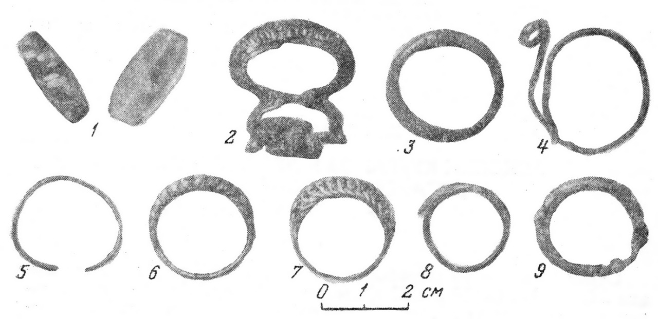 1 — бусы из кургана 5 у дер. Селец; 2-5 — пряжки, поясное кольцо и височные кольца из кургана 1 у дер. Селец; 6-9 — перстни и височные кольца из кургана 1 у дер. Ботаревка