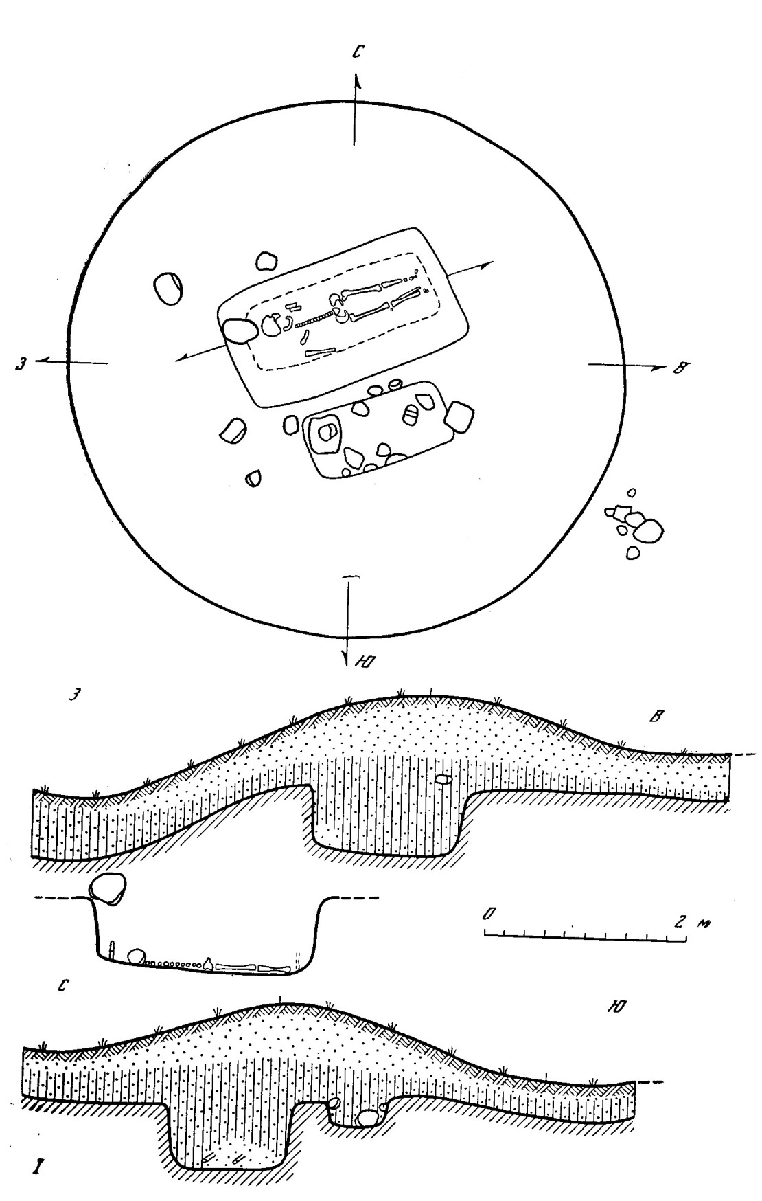 Костяк мужчины находился на глубине 1,0-1,1 м, в центре курганной площадки, в вытянутом положении, на спине, головой на юго-запад. Погребение лежало в темном гумусированном песчанистом слое, в котором не было замечено четких следов золы и угля, хотя в том же слое над погребением прослежены отдельные гнезда золы. На погребальной площадке, в пределах темного слоя встречены крупные камни. В насыпи кургана найдено несколько мелких окатанных черепков гончарных сосудов, в северо-западной поле кургана, у обреза раскопа, на глубине 8 см — железная подковка от сапога.