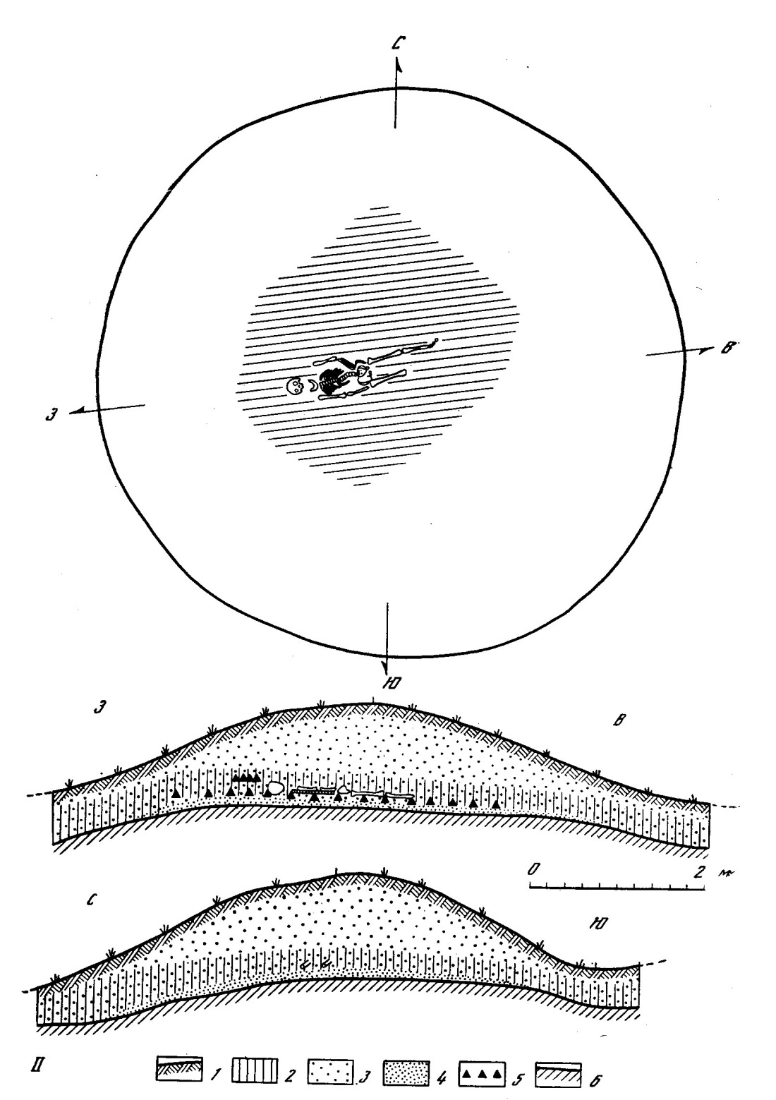 Все могильные ямы вырыты в материковом суглинке, имели прямоугольную в плане форму, вытянуты с востока на запад с небольшими отклонениями к северу или к югу. Размеры ям варьируют незначительно: длина 2,2-2,7 м, ширина 0,9-1,2 м, глубина 0,5-0,6 м от уровня поверхности материка. При одном погребении в кургане могильная яма располагается всегда в середине его основания; если же в кургане два погребения, обе ямы слегка смещены от середины площадки к краям, обычно в северном и южном направлениях, так, что обе ямы вместе занимают середину курганной площадки, что может указывать на одновременность захоронений (рис. 3, 1).