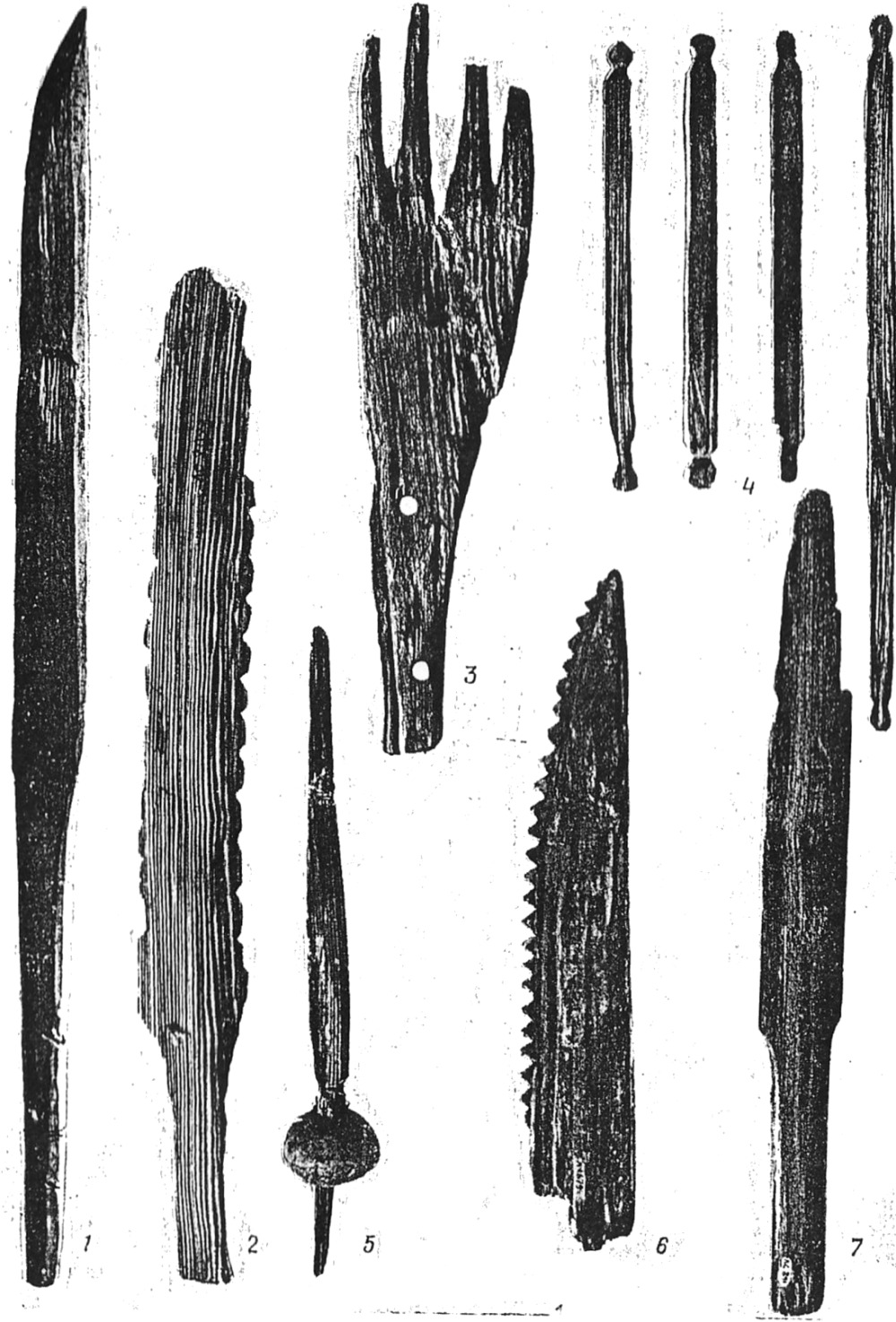 О местном производстве тканей из льна свидетельствуют найденные здесь орудия, связанные с его обработкой: 14 чесал, 13 трепал и I деревянный гребень7. Чесала — ножевидные орудия с зубьями по рабочему краю с одной или с двух сторон — употреблялись для сбивания головок со стеблей (рис. 3, 2,6). Трепала — ножсвидные орудия без зубьев (односторонние или двусторонние) — служили для отделения костры от волокна (рис. 3, 1, 7). Чесала и трепала обнаружены в самом нижнем слое поселения (горизонт Е3) н в горизонтах Е2, Е1 и Д.