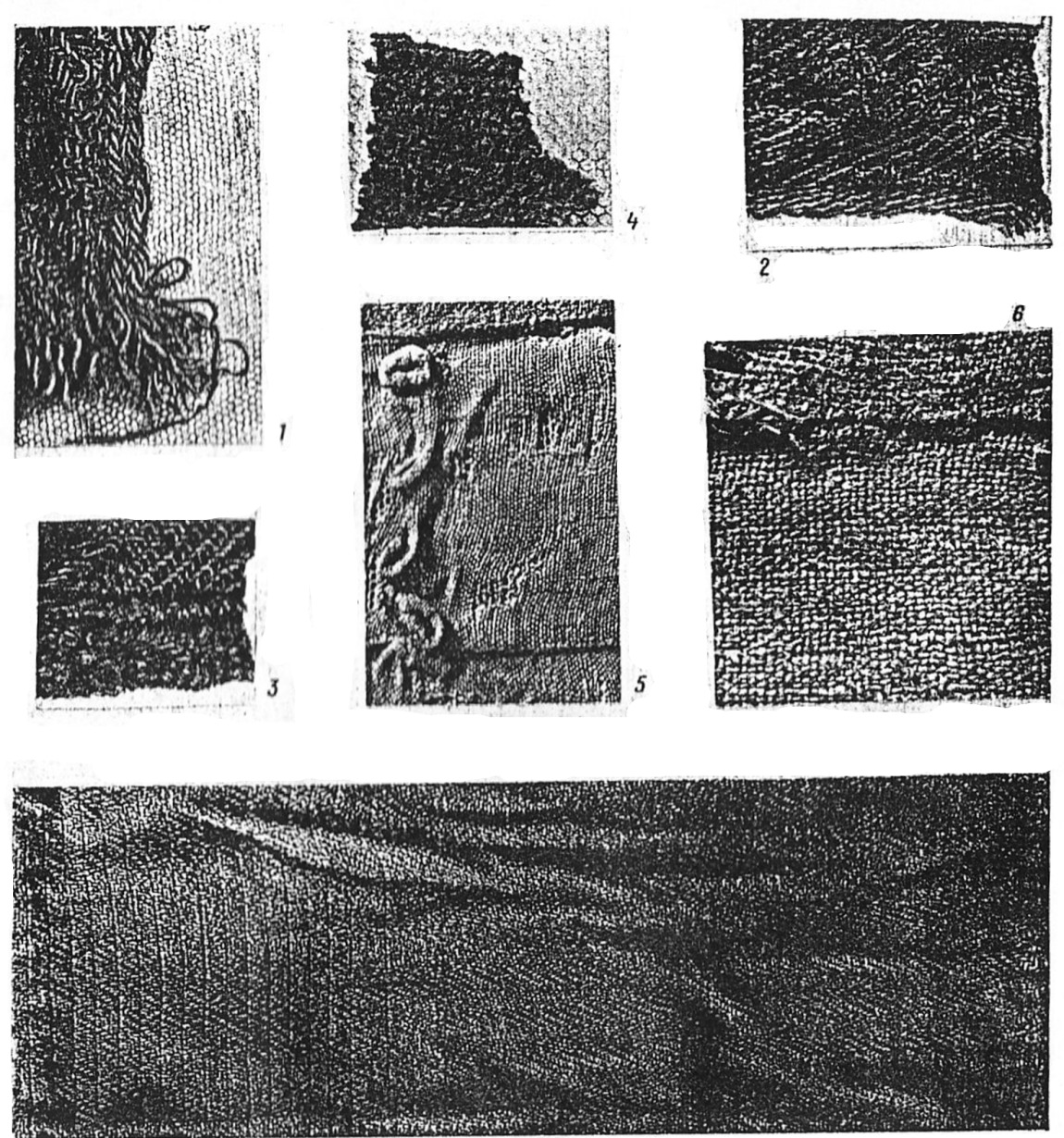 Эти ткани употреблялись для различных видов одежды. Для восстановления кроя одежды и техники ее шитья нет достаточных данных, но некоторые находки имеют в этом отношепнп определенный интерес.