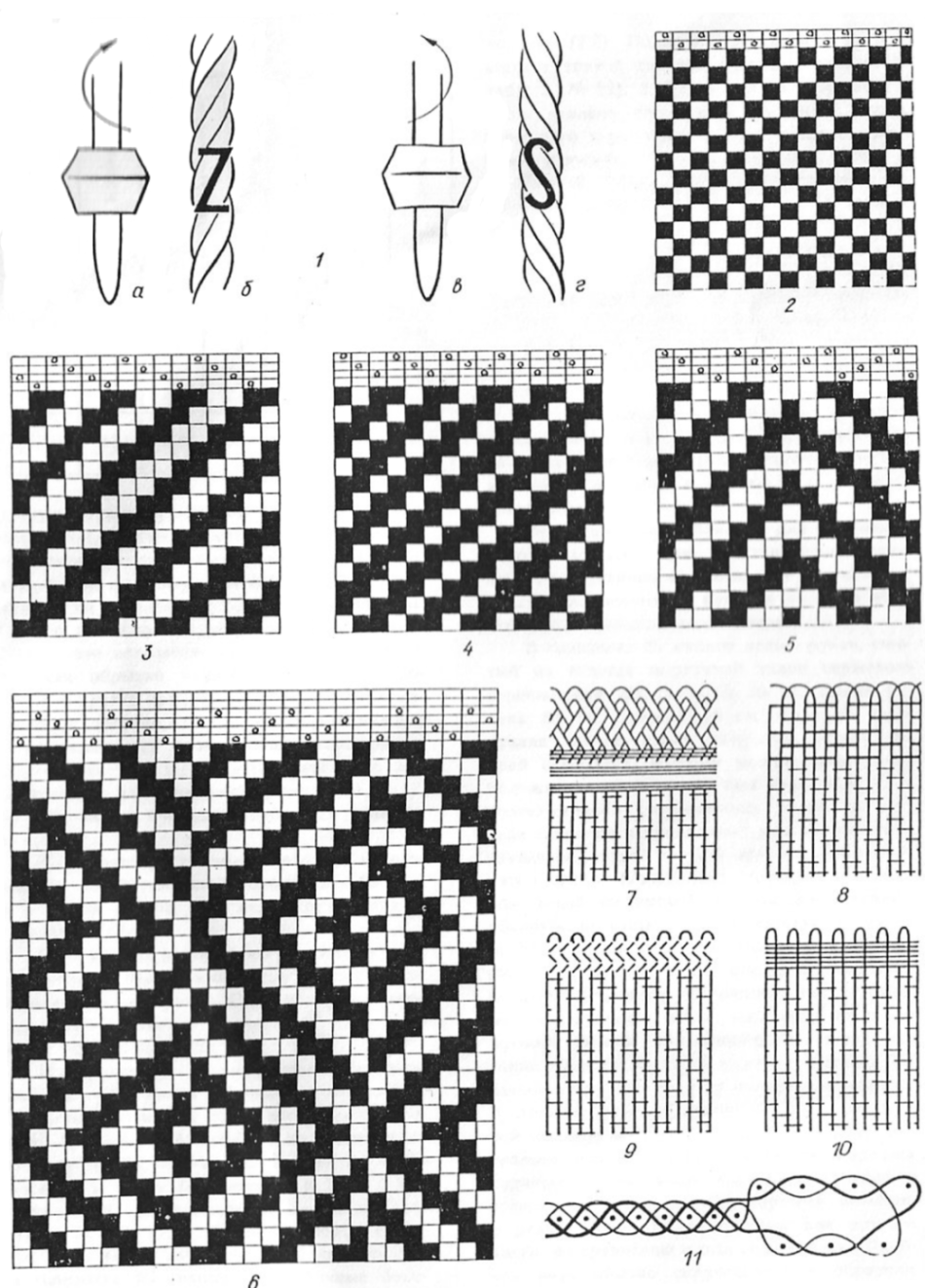 Рис. 1. Схема крутки нитей и схемы переплетений тканей: