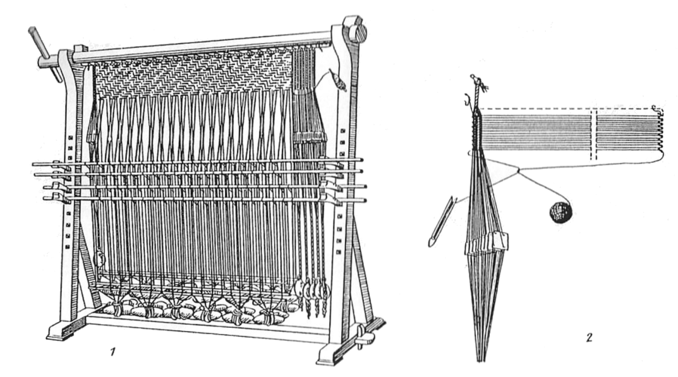 | 1 – вертикальный ткацкий станок; 2 – основание основы на вертикальном ткацком станке (Реконструкция – см.: Karl Schlabew. Trachten der Eisenzeit, Neumunster, 1961) |