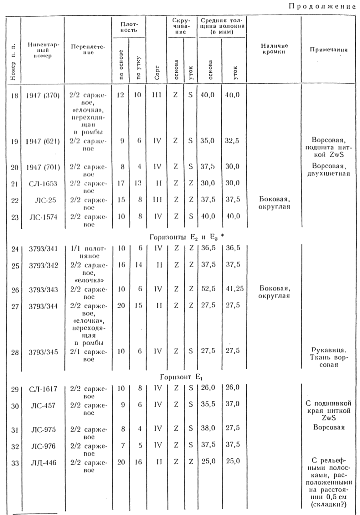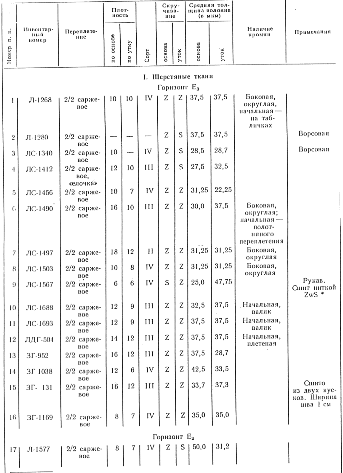 По сравнению с шерстяными тканями, льняные отличаются большей плотностью. Очень тонкая ткань 1 сорта встречена в горизонте Е3 с густотой нитей 28 по основе и 22 по утку (табл. 5, № 54). 3 образца относятся ко II сорту (горизонт Е3 и В) и 3 образца— к III сорту (горизонт Е3 — 2 экз., горизонт Е1—1 экз.). Ткань IV сорта встречена один раз в горизонте Г. У двух тканей нз горизонта Е3 сохранились обычные боковые кромки.