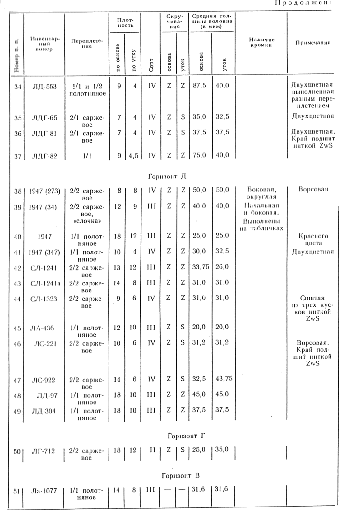 Нити одинаковой и различной крутки встречены в тканях как из горизонта Е, так и в тканях из вышележащих слоев, при этом количество тканей с нитями различной крутки пропорционально больше в горизонте Е, по сравнению с тканями горизонта Д (таблица 2).