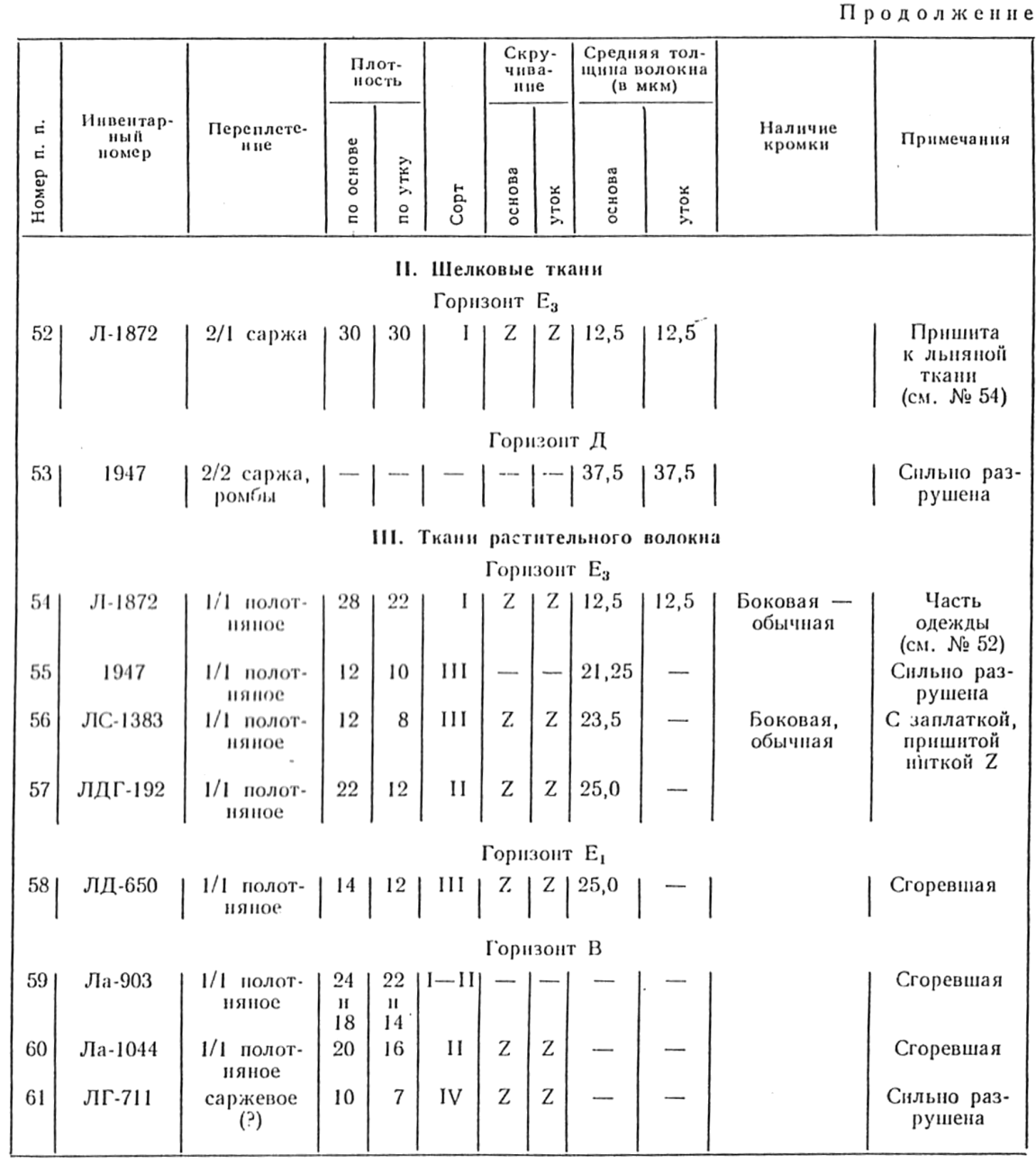 Шелковые ткани встречены в двух экземплярах: 1. Ткань коричневого цвета, саржевого переплетения 1/2, плотность 30/30, нити основы н утка имеют правостороннее скручивание (ZZ). Полоска этой ткани была пришита к тонкой льняной одежде (горизонт Е3, табл. 5, № 52). 2. Ткань сильно разрушена и лишь условно определена как шелк. Ткань саржевого переплетения 2/2 с рисунком ромбами (горизонт Д, табл. 5, № 53).