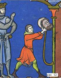 В основу реконструкции брэ легли многочисленные миниатюрные и скульптурные изображения середины, второй половины ХІІІ века, для примера изображение из Библии кардинала Мациевского (рис.5) и фрагмент барельефа из кафедрального собора в Реймсе, Франция (рис.6). На рисунке 7 а и 7 б, изображен мой вариант реконструкции брэ.
