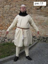 2. Котта – верхняя рубаха из сукна, возможно льна. Могла быть как на подкладке, так и без нее. Котты есть в артефактах (Бокстенский утопленник) и в изобразительных источниках (книжные миниатюры, фрески, скульптура). Для реконструкции мною был выбран один из вариантов показанных в Библии кардинала Мациевского (рис.11)