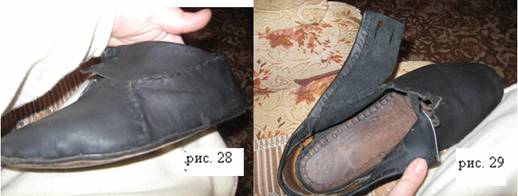 В выборе обуви я руководствовался тем богатым арсеналом находок, который опубликован в замечательной обзоре находок обуви из Лондона «Shoes and Pattens» автора Francis Grew & Margrethe De Neergaard, (c) 1988, 2001 Museum of London. Как наиболее характерную и одновременно удобную для ношения обувь я выбрал toggle ankle-shoes найденный в слоях второй половины ХІІІ века (рис. 25, 26, 27), произвел реконструкцию употребляя все характерные для того периода технологии пошива обуви, включая и рядно-торцевой шов с рантом. Вариант реконструкции – рис. 28, 29.