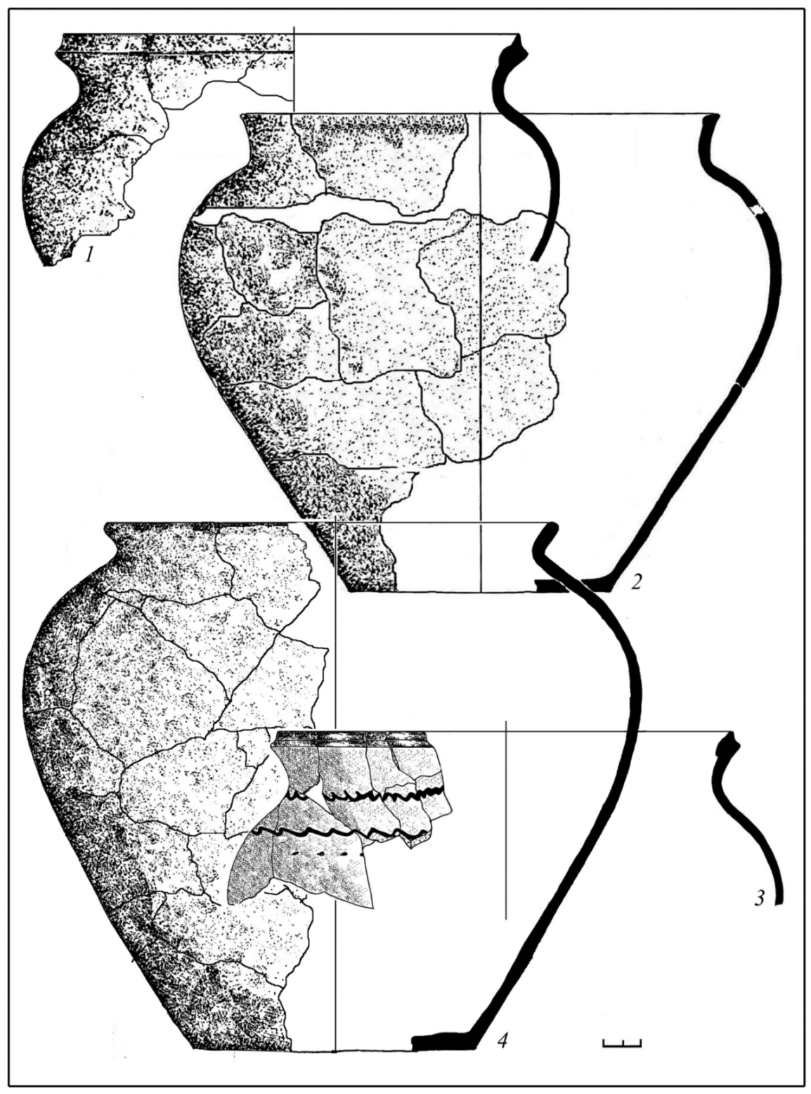 Совершенно иной характер имеет постройка за основным рвом городища в раскопе 1, 2002 года, которая представляет собой полуземлянку прямоугольной формы размерами по дну 600 на 290 см, углубленную в материк на 120 см. Стены полуземлянки, так же как и наземного дома, ориентированы по сторонам горизонта и укреплены деревянной конструкцией, от которой по краю котлована сохранились обугленные фрагменты. По всей вероятности, это был сруб, встроенный в землю. Вход в землянку находился, вероятно, в боковой восточной стене, где фиксируются уступы, укрепленные камнем. Традиционной марийской постройкой является амбар для хранения зерна, в котором нередко помещали ручную мельницу. Пол амбара, как правило, был поднят над землей на столбах. К сожалению, данный тип постройки трудно определяется археологическими методами изучения.