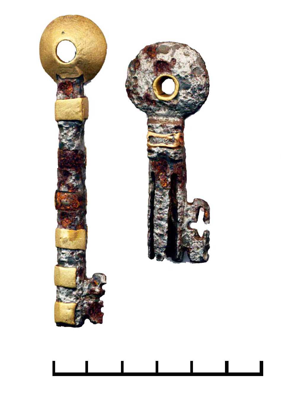 Бытовые предметы: Замки – пять целых изделий и дужки или отдельные фрагменты еще от девяти экземпляров. Замки относятся к различным группам. Группа 1. Навесные замки с выдвижной дужкой и расходящимися пружинами.  Группа 2. Замочек из цветного металла в виде стилизованного изображения лошади. Поверхность украшена кружковым орнаментом. Ключи – 11 экз. По форме ключи делятся на отделы: а) коленчатые, б) простые уплощенные, в) с выступом на стержне,  г) ключи с полым стержнем и бородкой на конце, д) ключи с массивным стержнем. Ключи а–в использовались с замками вышеописанной группы 1. Ключи г–д служили для открывания прирезных накладных комбинированных деревянных с металлическим внутренним механизмом или цельнометаллических замков.