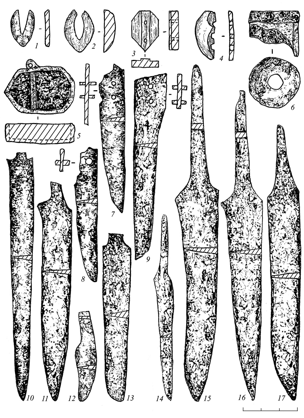 В культурном слое городища найдены отдельные украшения, предметы быта, вооружения, позволяющие составить определенное представление о материальной культуре населения середины II тысячелетия. До настоящего времени имелись лишь единичные вещи этого периода. Изделия выполнены из черного или цветного металла, кости, керамики. Характеристика инвентаря дается по основным функциональным категориям.