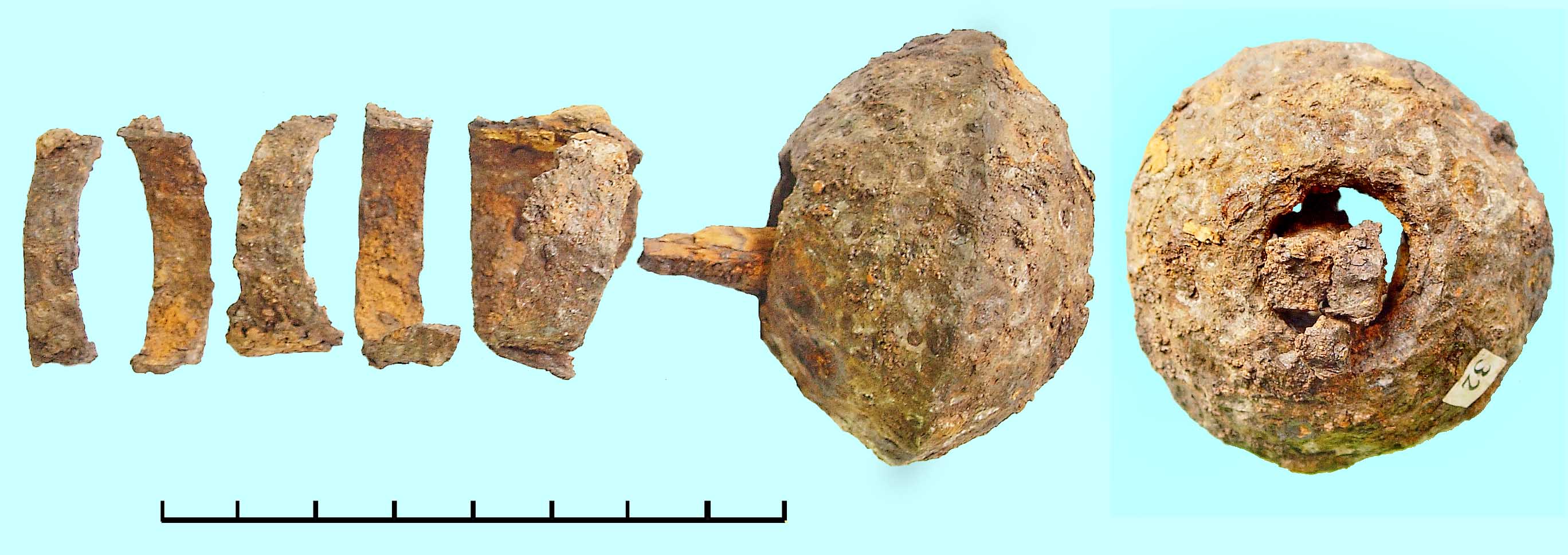 Доспех Кольчуга. Фрагмент кольчуги состоит из железных звеньев подпрямо-угольной формы. Размеры звеньев 8 на 6 мм, сделаны из круглой проволоки толщиной 1,5 мм. Звенья с одной стороны незавершенные, концы загнуты вверх.  Стремена – 2 экз. Одно изделие сохранилось полностью, имеет арочный контур, широкую подножку и выступающую прямоугольную дужку с горизонтальной прорезью для путлищ.