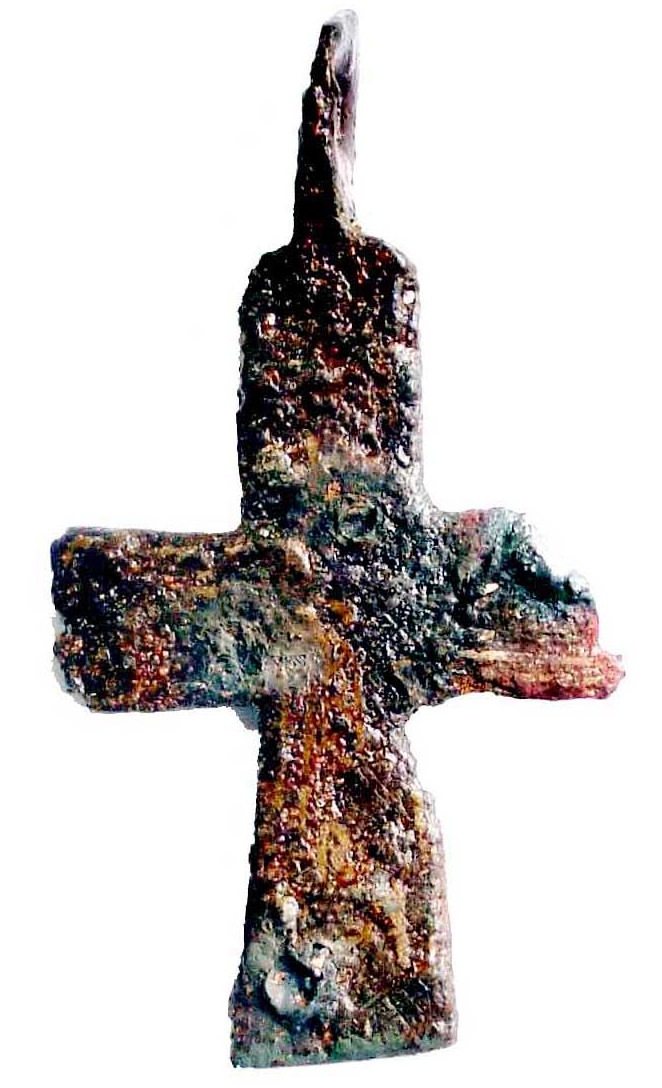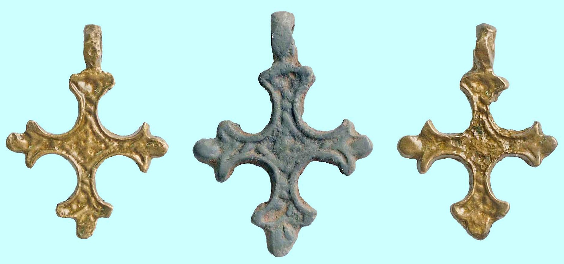 Кресты – 8 экз. По материалу кресты делятся на каменные и бронзовые.  Аналогий данным изделиям не обнаружено, но по технике оформления концов и пропорциям они близки находкам с Никулицына городища (Макаров Л. Д. 2001. Рис. 59–2; Полубояринова М. Д. 1997. Табл. 121–15). На Руси подобные кресты получили распространение в XIV-XV вв. (Полубояринова М. Д. 1997. С. 217). В материалах Новгорода в слое XIV -начала XV в. близкие по форме кресты не имеют дополнительных выступов на концах (Седова М. В. 1981. Рис. 16–8).