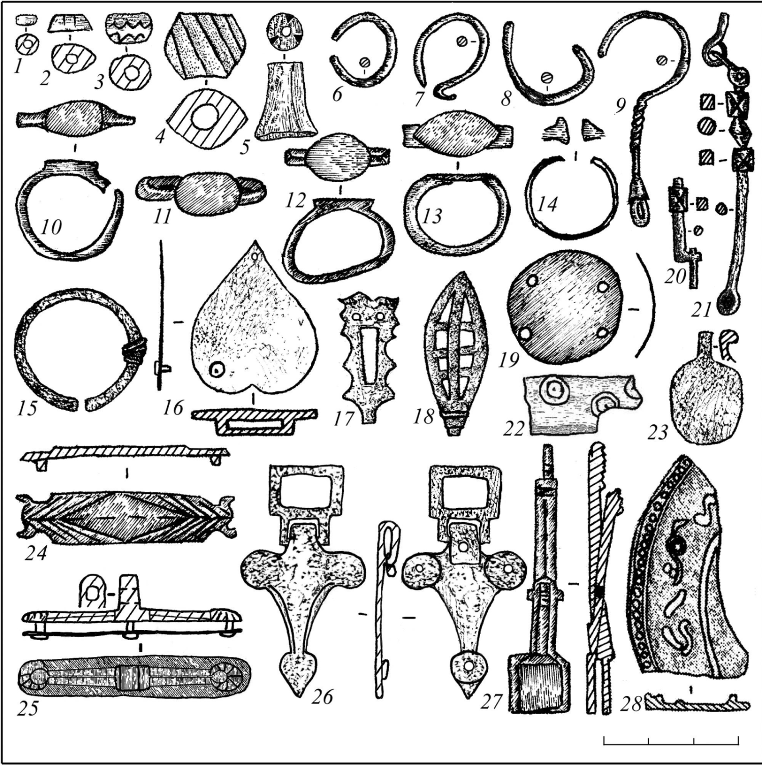 Серьги и височные кольца изготовлены из цветного металла. Височные кольца представлены перстнеобразными проволочными бронзовыми и серебряными изделиями – 3 экз. Серьга в форме знака вопроса из медной проволоки. Стержень имеет дополнительную проволочную обмотку и нанизанную бусину. В марийском костюме XVI–XVII вв. аналогичные украшения стали этноопределяющими, но имели в большинстве случаев более крупные размеры и использовались в качестве височных колец (Никитина Т. Б. 1992. С. 52 ).  Перстни – 6 экз. Все перстни относятся к типу перстней-печаток и имеют щиток, на котором иногда заметны слабые неясные очертания каких-то изображений. Бусы – 5 экз. Костяная пластина. Найден фрагмент тонкой пластины с циркульным орнаментом, толщина пластины 1,5 мм. Накладки различаются по материалу, из которого изготовлены. «Копоушки» – 5 экз., различаются по материалу.  Зеркало – 1 фрагмент из цветного металла с высоким краем и нечетким изображением животных, бегущих по кругу. Диаметр изделия 7–8 см. Зеркало близко изделиям отдела К по типологии Г. А. Федорова-Давыдова, имеет аналогии в Болгаре, Увеке, Новом Сарае и датируется второй половиной XIII-XIV вв. (Федоров-Давыдов Г. А. 1966. С. 82, 116, рис. 14–3). Бронзовые пластинки – 2 экз., подквадратной формы, с одним отверстием. Подвеска – 1 экз., из железа овальной формы с загнутым ушком. Размеры подвески 1,6 на 2 см.